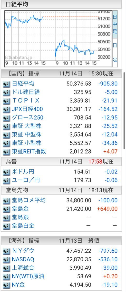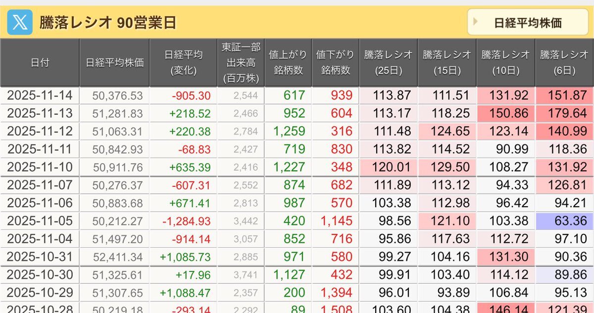 11/14(金)引け乙です🍁 🇯🇵NK 50,376.53🔹-3905.30 TOPIX 3,359.81🔹-21.91 グロース 708.54🔹-12.95 🔶売買代金 🔼値上がり数% P🔸6,680,598百万円🔼38% S🔸 177,271百万円🔼38% G🔸 152,599百万円🔼31% 騰落レシオ111.87⬜️⬜️🟧🟥 #日本株 #株トレード #株式市場 pic.x.com/l6tk5pQool