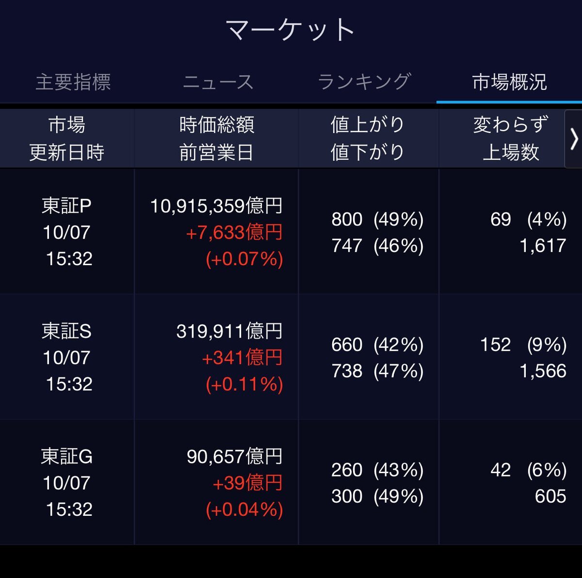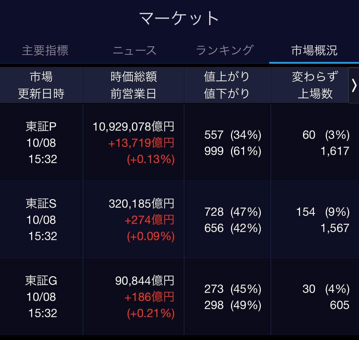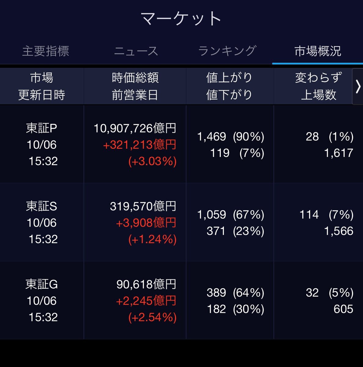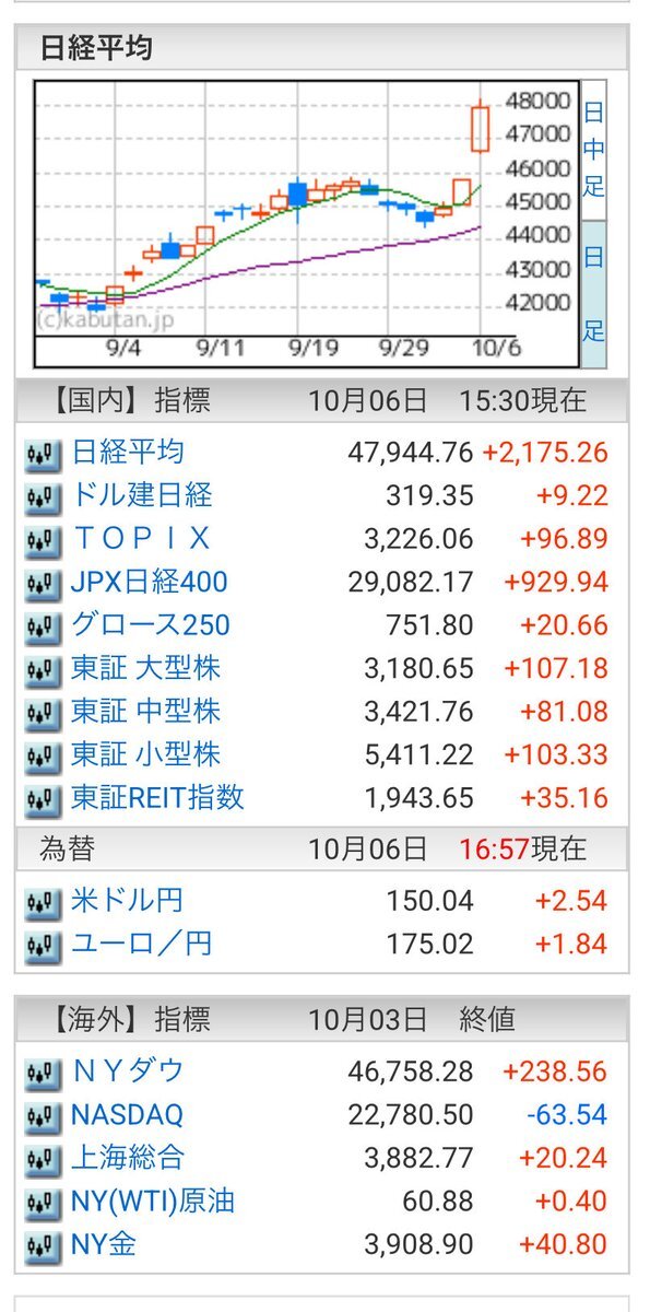 10/6(月)引け乙です🍄 🇯🇵NK 47,944.76🔺+2175.26 TOPIX 3,226.06🔺+96.89 グロース 751.80🔺+20.66 🔶売買代金 🔼値上がり数% P🔸7,889,930百万円🔼90% S🔸 189,512百万円🔼67% G🔸 208,629百万円🔼64% 騰落レシオ109.28⬜️⬜️⬜️🟩 #日本株 #株トレード #株式市場 pic.x.com/hZM7qUxEdZ