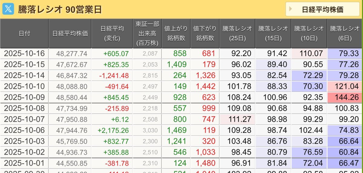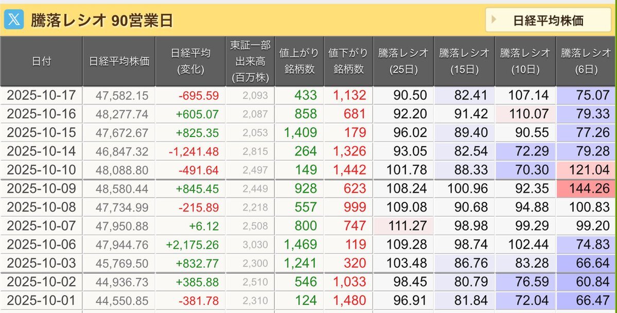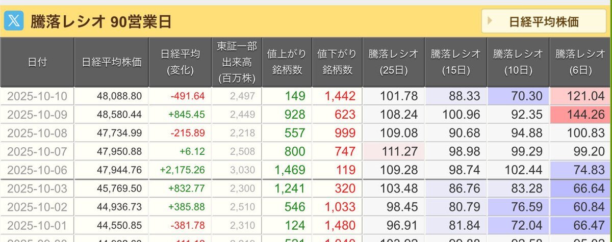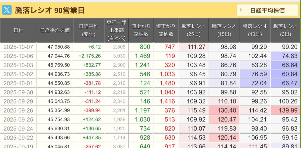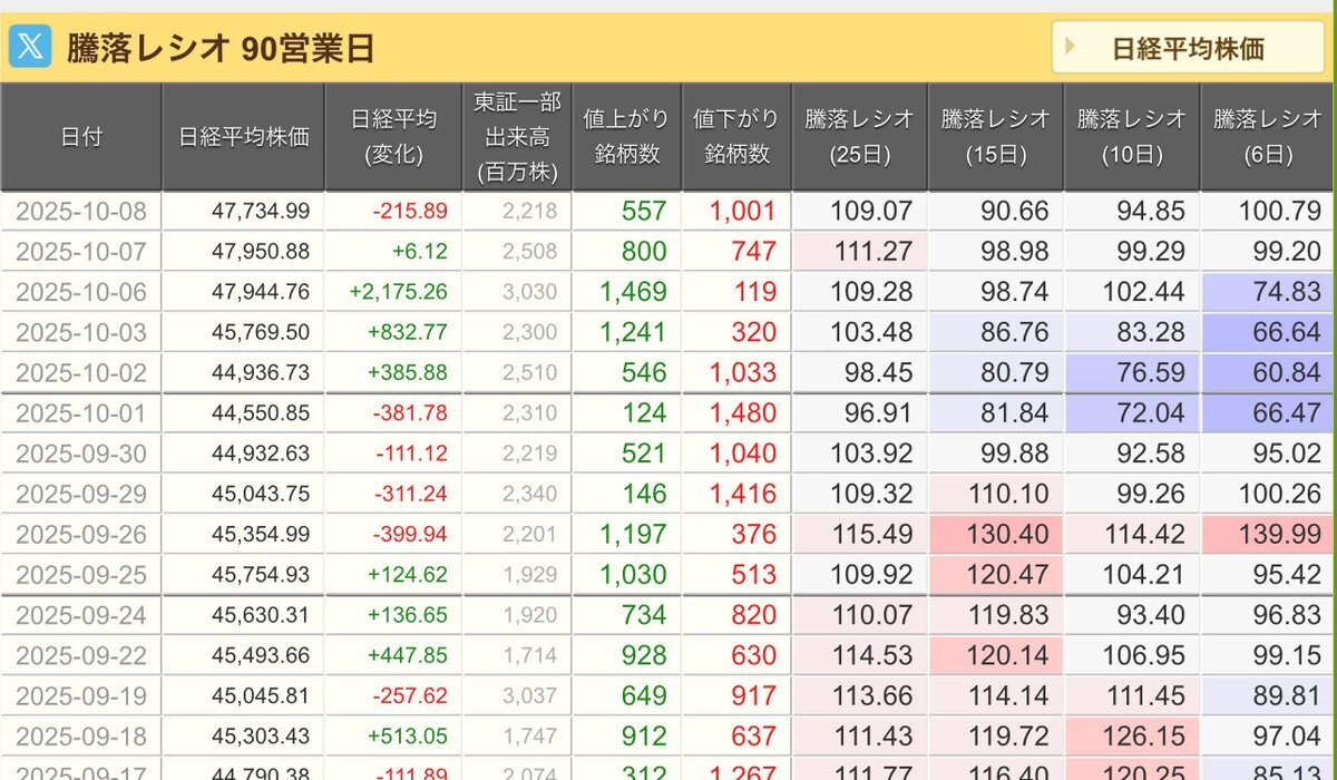 10/10(金)引け乙です🍄 🇯🇵NK 48,088.80🔹-491.64 TOPIX 3,197.59🔹-60.18 グロース 746.37🔹-12.87 🔶売買代金 🔼値上がり数% P🔸6,338,251百万円🔼9% S🔸 181,909百万円🔼19% G🔸 189,698百万円🔼21% 騰落レシオ101.78⬜️⬜️🟩🟧 #日本株 #株トレード #株式市場 pic.x.com/1BiIaVOaXt