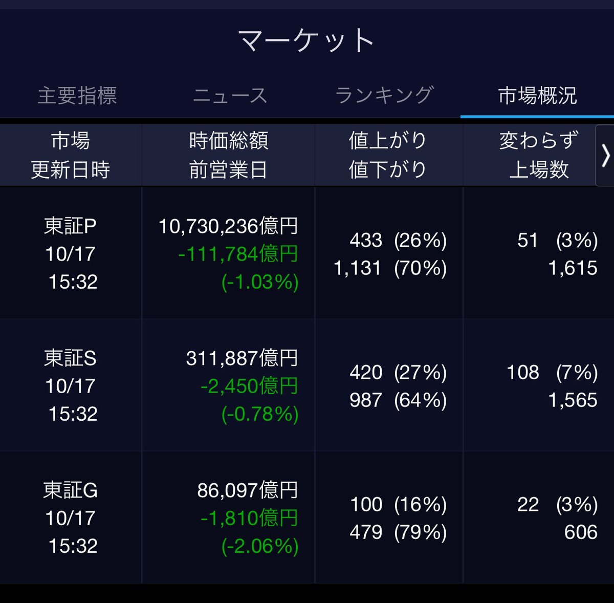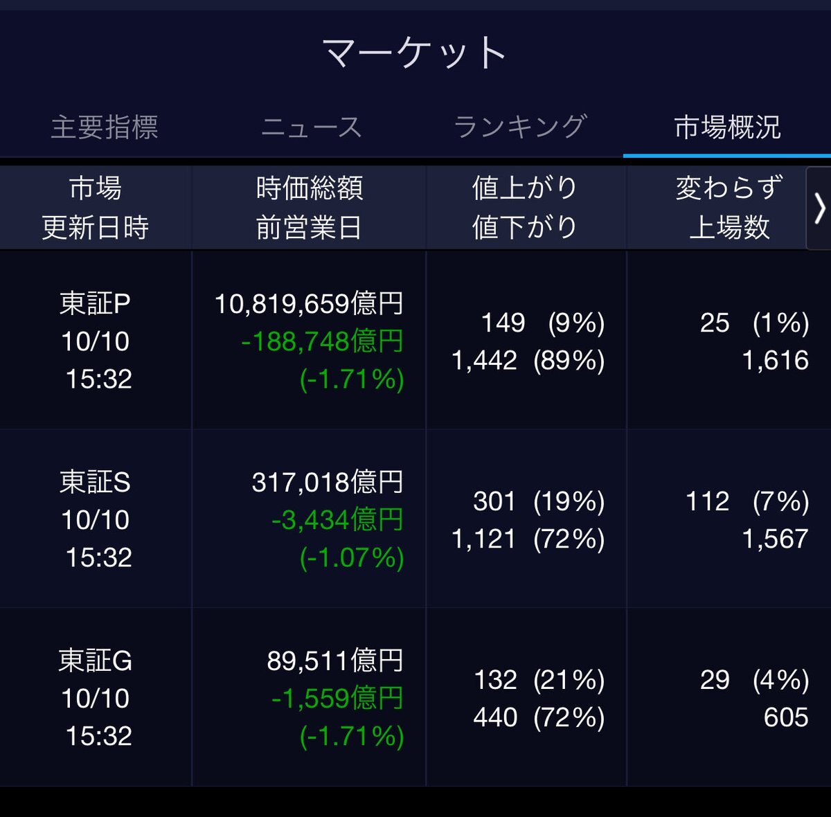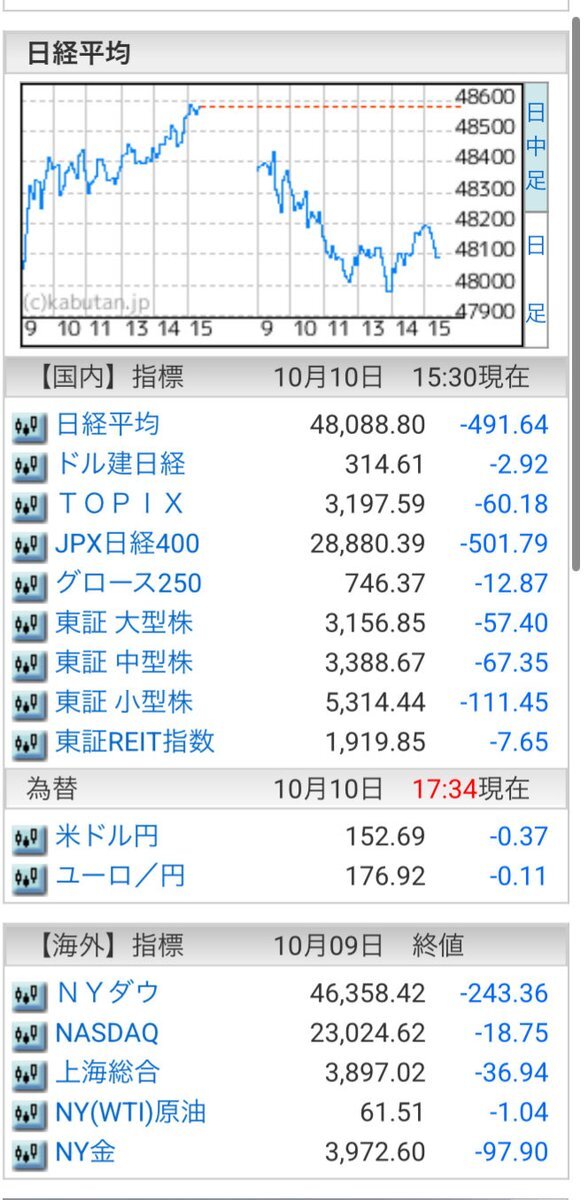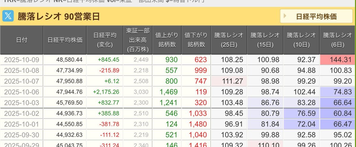 10/10(金)引け乙です🍄 🇯🇵NK 48,088.80🔹-491.64 TOPIX 3,197.59🔹-60.18 グロース 746.37🔹-12.87 🔶売買代金 🔼値上がり数% P🔸6,338,251百万円🔼9% S🔸 181,909百万円🔼19% G🔸 189,698百万円🔼21% 騰落レシオ101.78⬜️⬜️🟩🟧 #日本株 #株トレード #株式市場 pic.x.com/1BiIaVOaXt