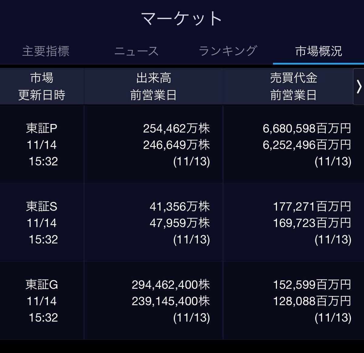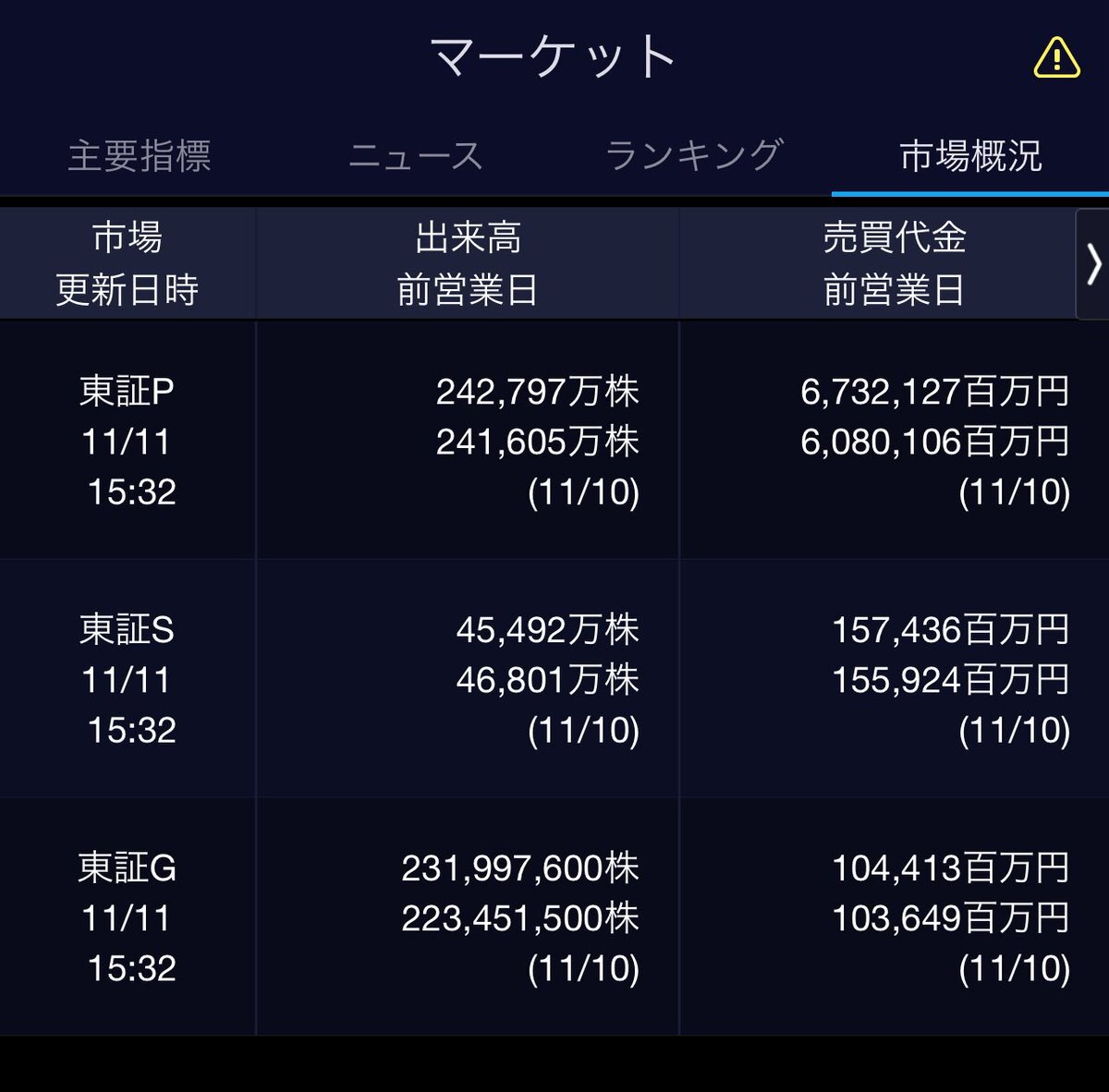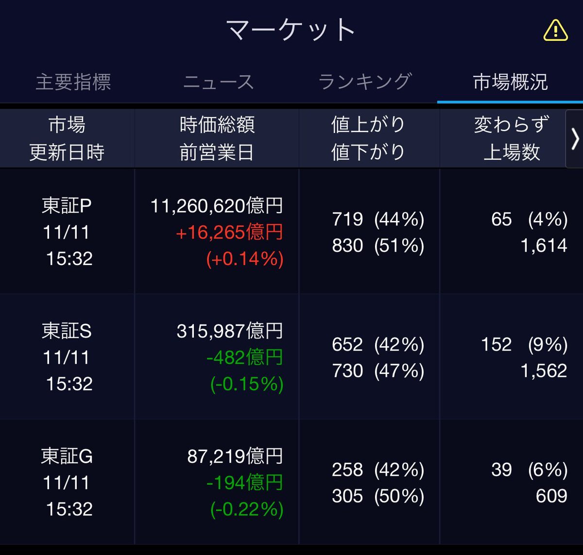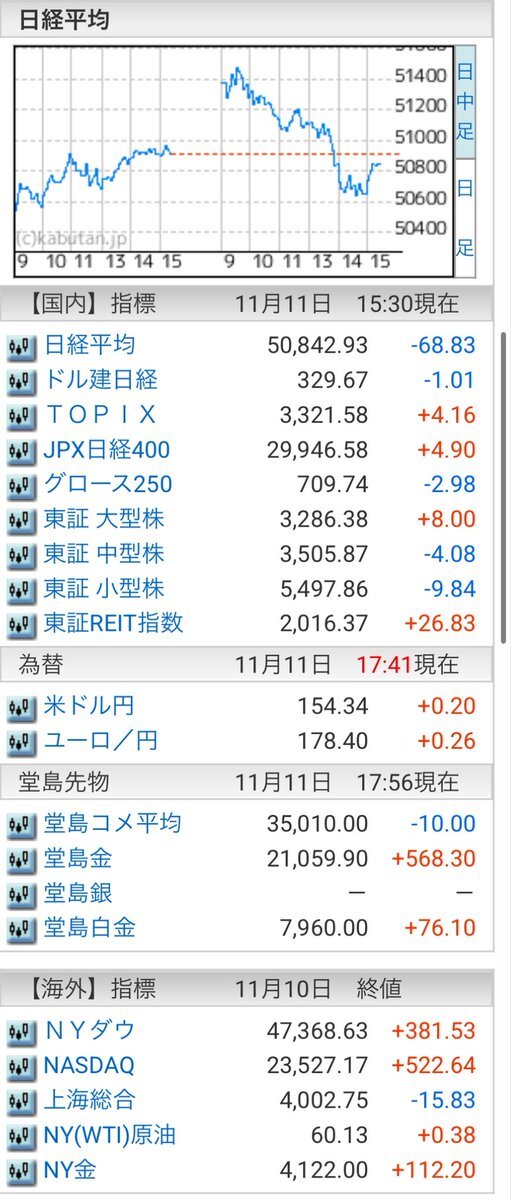 11/11(火)引け乙です🍁 🇯🇵NK 50,842.93🔹-68.83 TOPIX 3,321.58🔺+4.16 グロース 709.74🔺+8.00 🔶売買代金 🔼値上がり数% P🔸6,732,127百万円🔼44% S🔸 157,436百万円🔼42% G🔸 104,413百万円🔼42% 騰落レシオ113.82⬜️⬜️⬜️⬜️ #日本株 #株トレード #株式市場 pic.x.com/Ov7MQ3tNoQ