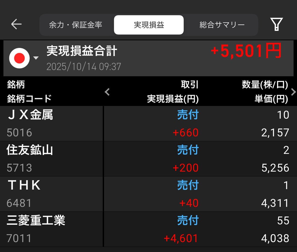 皆さま こんにちは☺️ 《株式編》 本日の利益確定❣️ 信用取引を申し込みして 今日から同じ銘柄を 数回取引できるのが嬉しいなぁ〜 #JX金属 #住友鉱山 #THK #三菱重工業 #利益確定 #株トレード #ディナー代 pic.x.com/PNmJnDArPg
