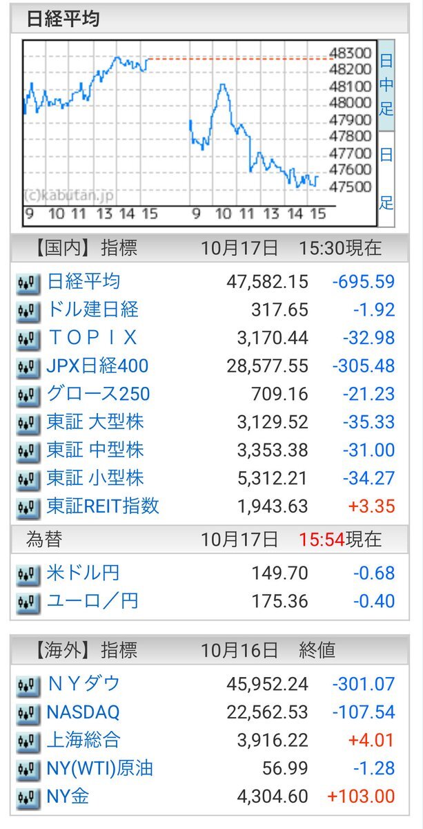 10/17(金)引け乙です🍄 🇯🇵NK 47,582.15🔹-689.59 TOPIX 3,170.44🔹-32.98 グロース 709.16🔹-21.23 🔶売買代金 🔼値上がり数% P🔸5,095,263百万円🔼26% S🔸 179,957百万円🔼27% G🔸 220,374百万円🔼16% 騰落レシオ90.50⬜️⬜️⬜️🟩 #日本株 #株トレード #株式市場 pic.x.com/wnoCGuY9z3