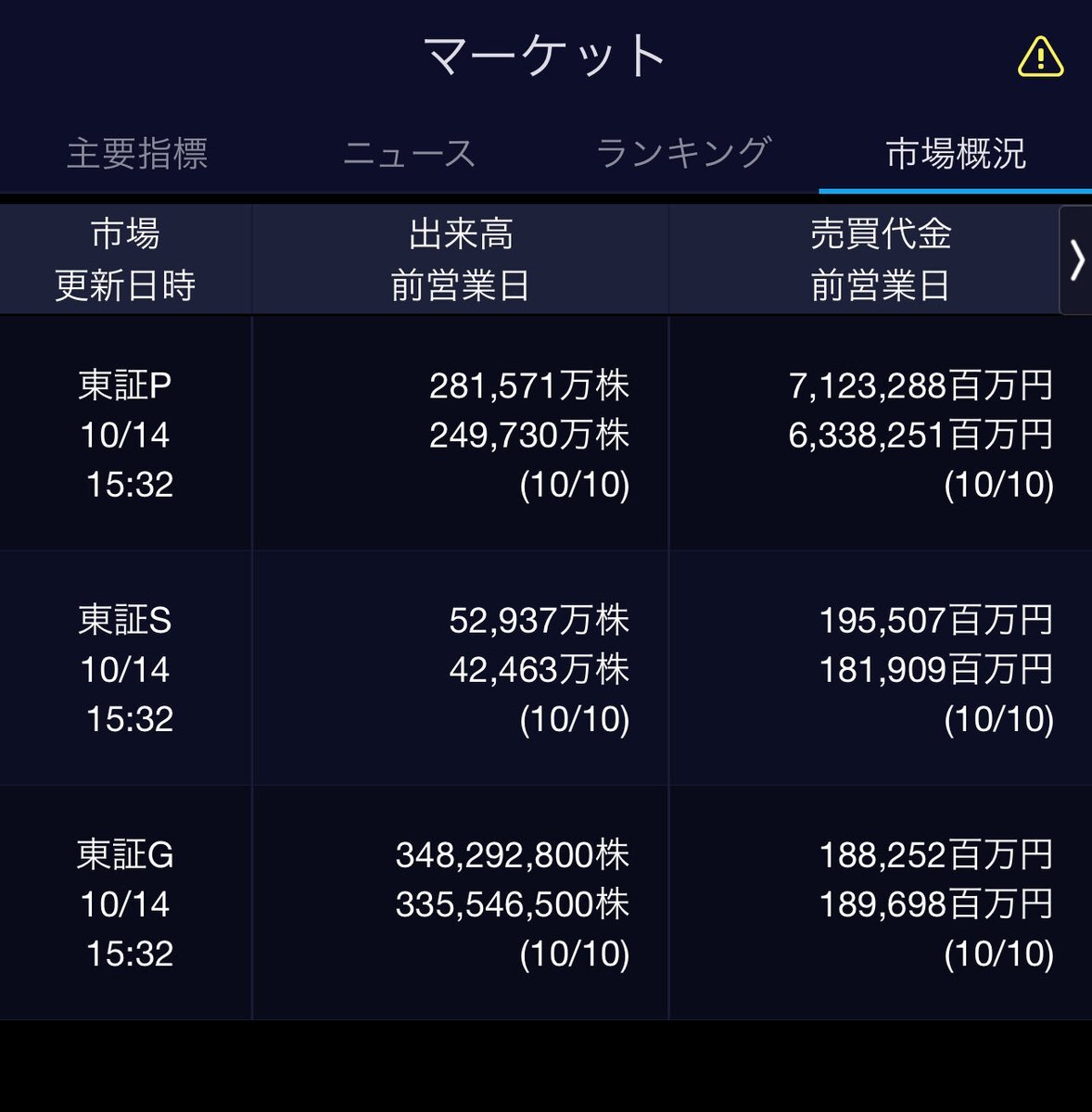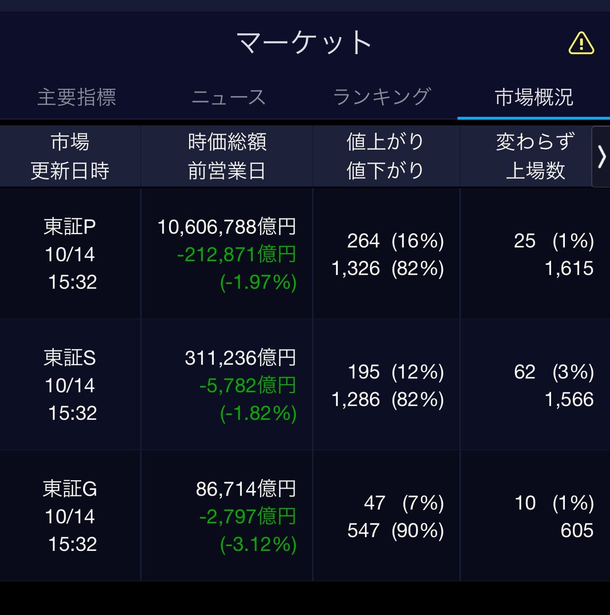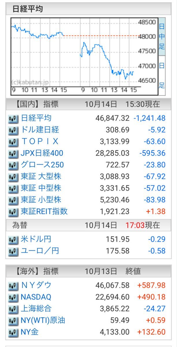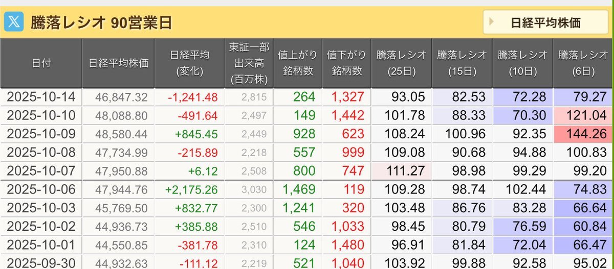 10/14(火)引け乙です🍄 🇯🇵NK 46,547.32🔹-1241.48 TOPIX 3,133.99🔹-63.60 グロース 722.57🔹-22.80 🔶売買代金 🔼値上がり数% P🔸7,123,288百万円🔼16% S🔸 195,507百万円🔼12% G🔸 188,252百万円🔼7% 騰落レシオ93.05⬜️⬜️🟩🟩 #日本株 #株トレード #株式市場 pic.x.com/96SL9Nimay