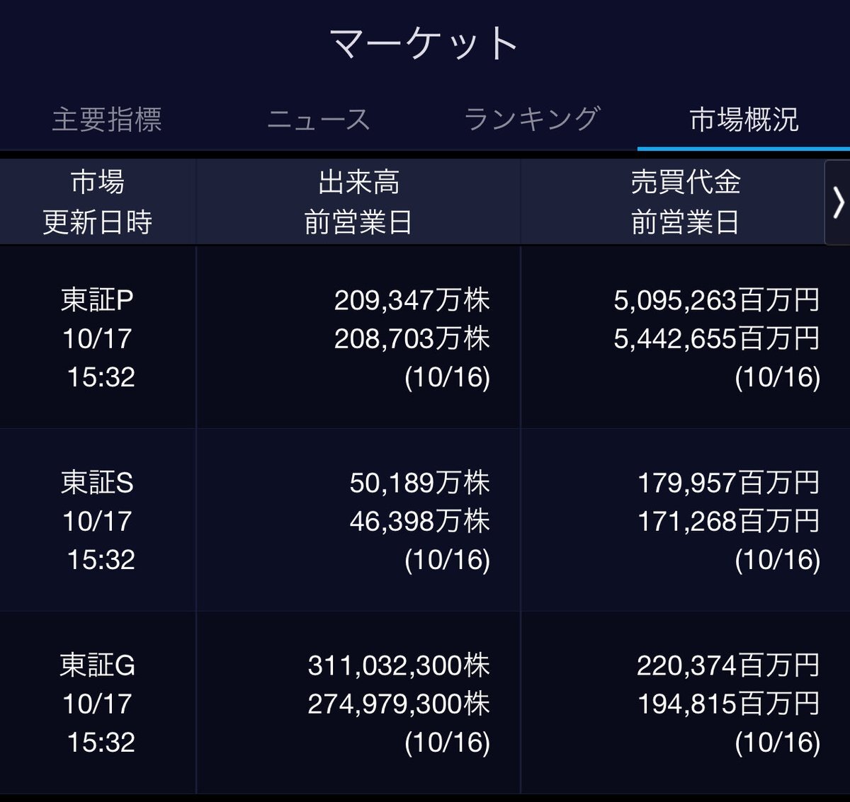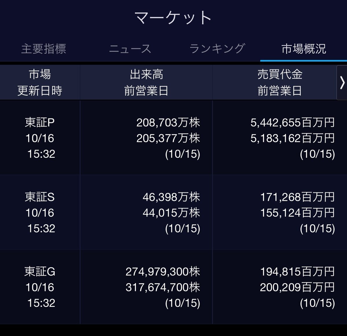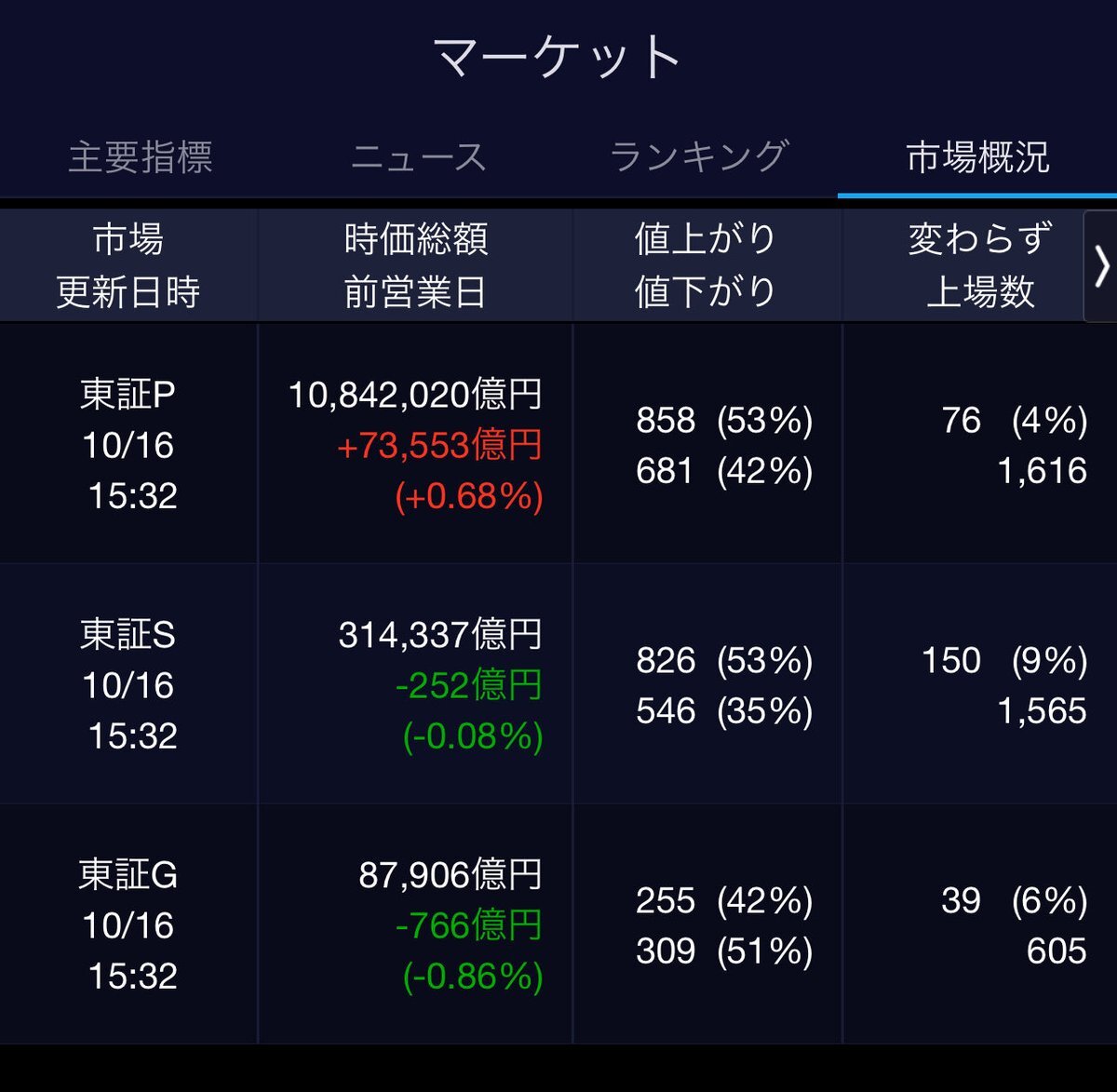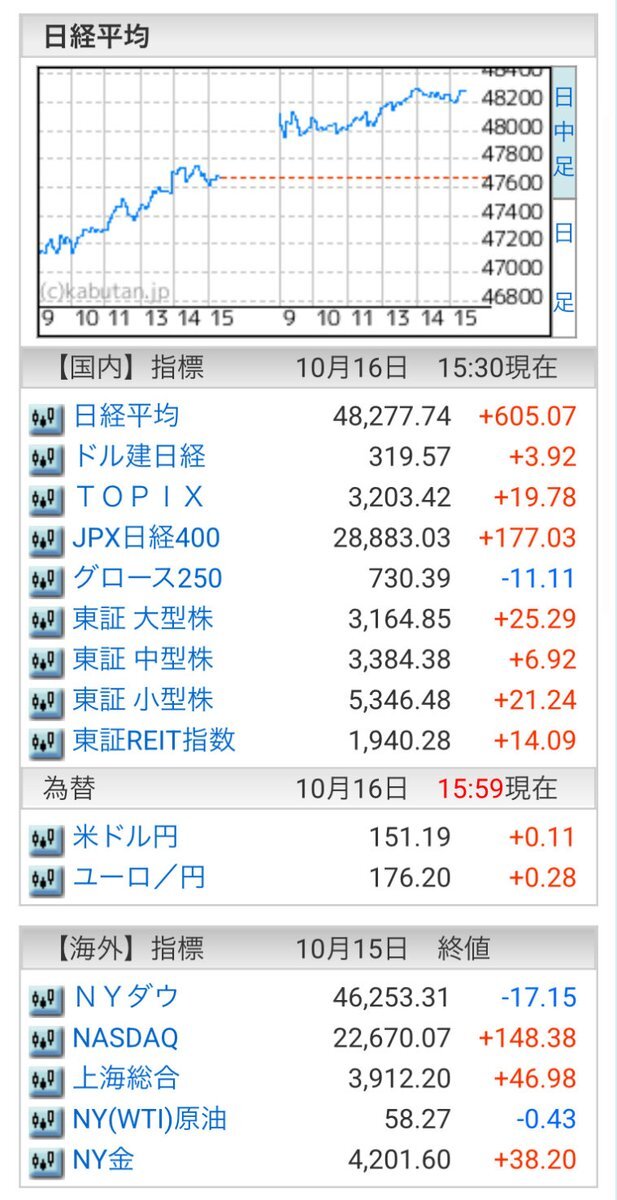 10/16(金)引け乙です🍄 🇯🇵NK 48,77.74🔺+605.07 TOPIX 3,203.42🔺+19.78 グロース 730.39🔹-11.11 🔶売買代金 🔼値上がり数% P🔸5,442,655百万円🔼53% S🔸 171,268百万円🔼53% G🔸 194,815百万円🔼42% 騰落レシオ92.20⬜️⬜️🟨🟩 #日本株 #株トレード #株式市場 pic.x.com/apeDzV5iPn