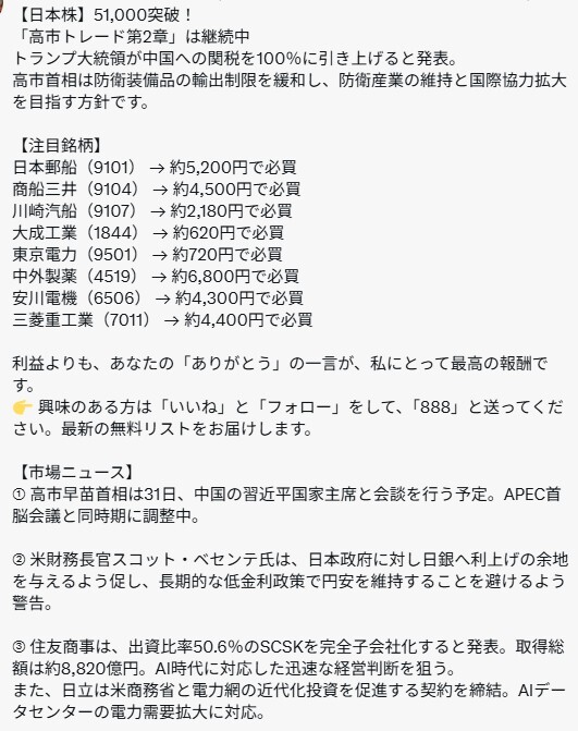 【日本株】51,000突破! 「高市トレード第2章」は継続中 トランプ大統領が中国への関税を100%に引き上げると発表。 高市首相は防衛装備品の輸出制限を緩和し、防衛産業の維持と国際協力拡大を目指す方針です。 #日本株 #日本株投資 #株式市場 #株初心者 #日本株情報 #株トレード pic.x.com/KPweBYM3HH x.com/DulcieLeia4900…
