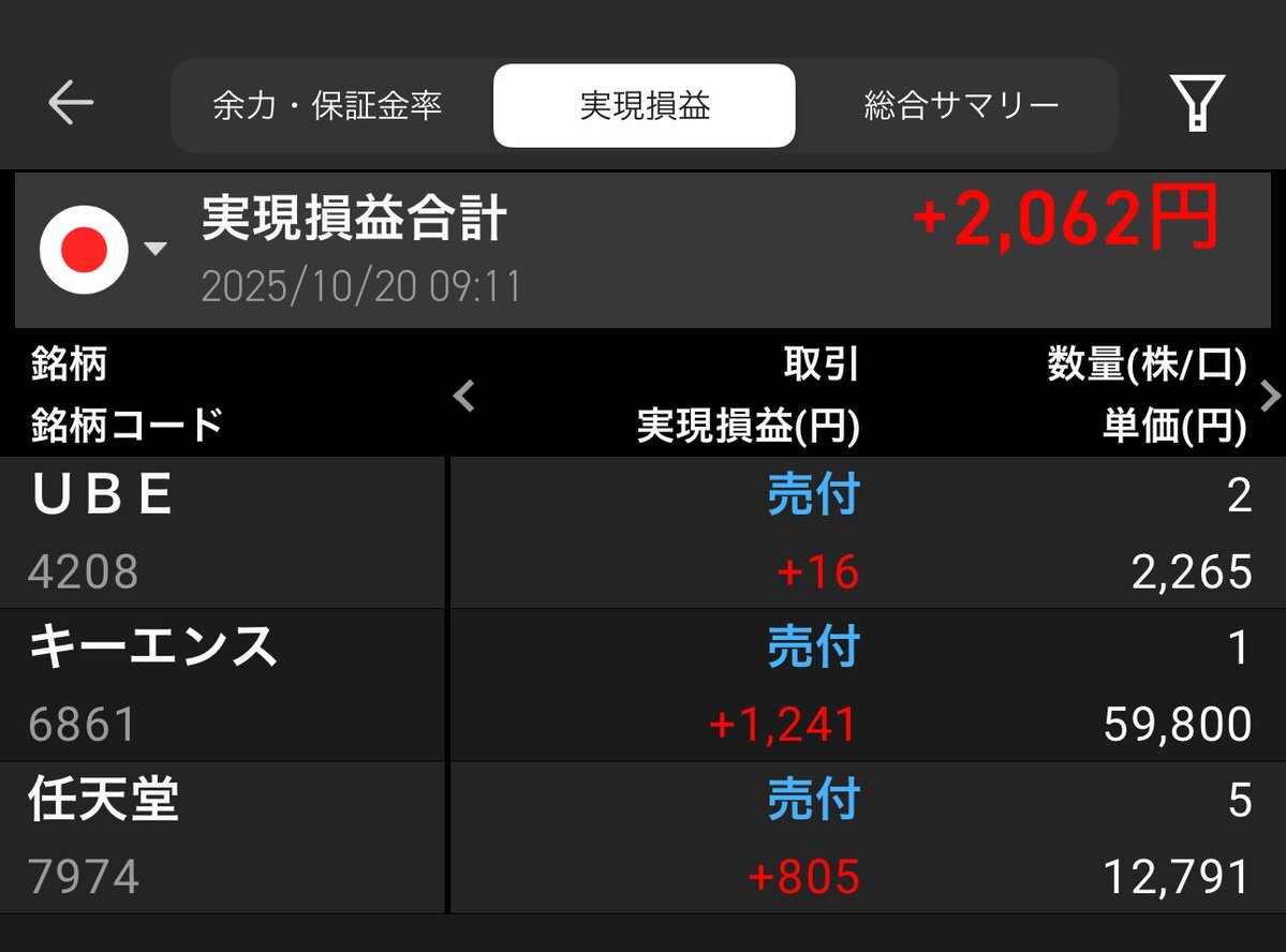 皆さま  おはようございます😃 《株式編》 本日の利益確定❣️ プラ転したから即利確〜 キーエンスは監視銘柄じゃない けど最近、久しぶりに見て ミニ株買ってたの。 #UBE #キーエンス #任天堂 #利益確定 #株トレード #ランチ代 pic.x.com/jyhzUTHcsw