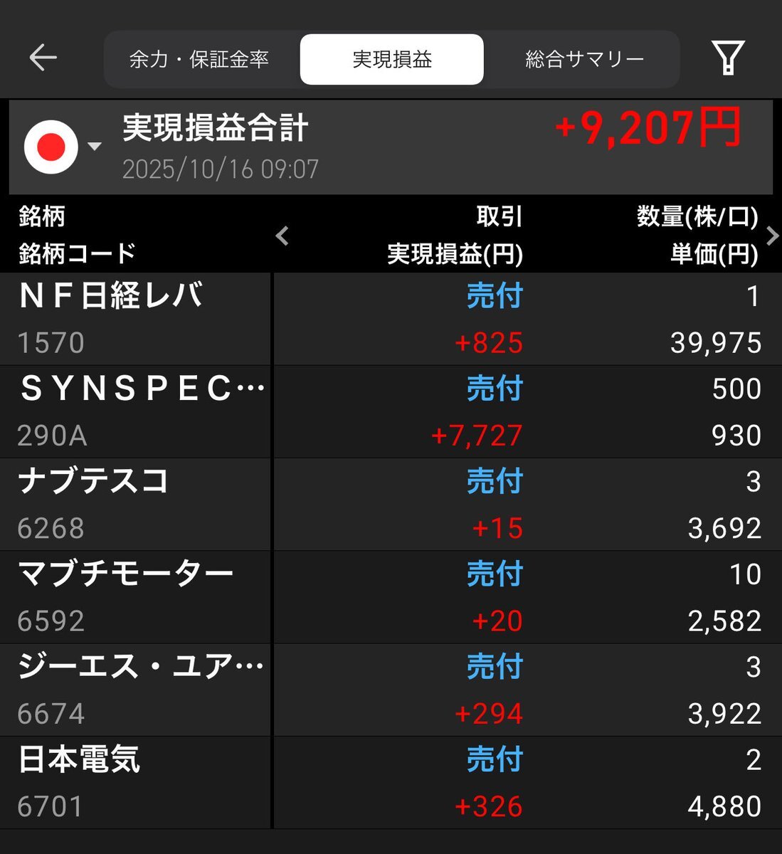 皆さま  おはようございます😃 《株式編》 本日の利益確定❣️ プラ転して一部を板で注文してみたよん。 #日経レバ #SYNSPECTIVE #ナブテスコ #マブチモーター #GSユアサ #NEC #利益確定 #株トレード #ディナー代 pic.x.com/gHnr0eHIAj