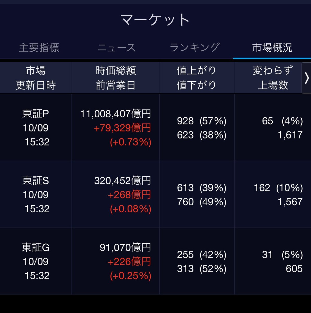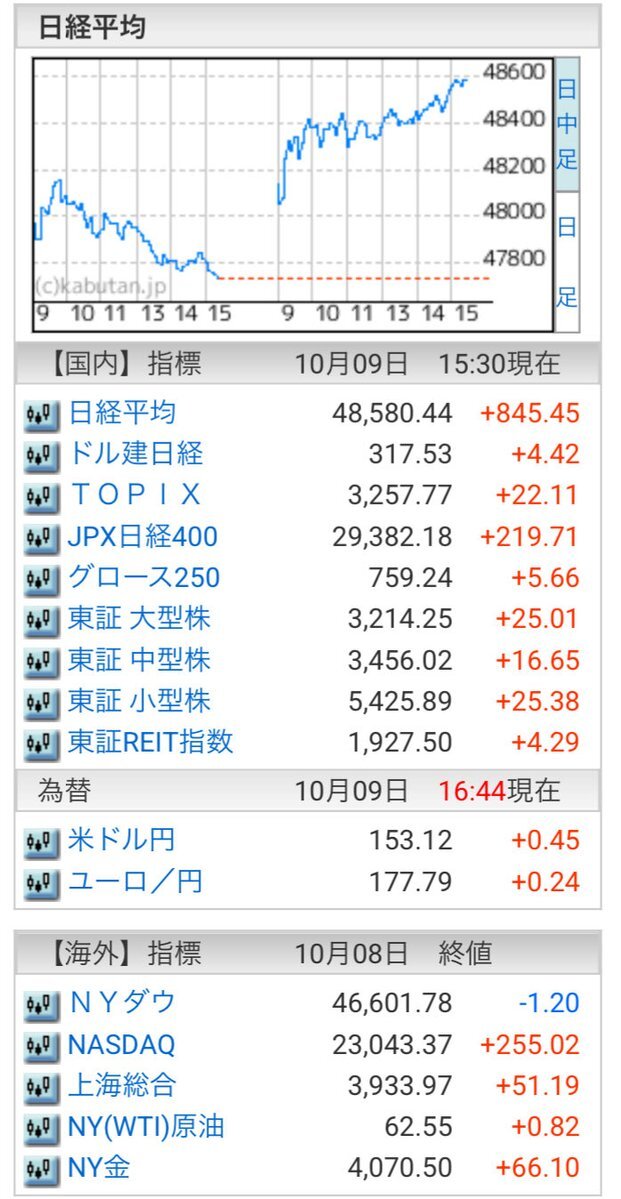 10/9(木)引け乙です🍄 🇯🇵NK 48,580.44🔺+845.45 TOPIX 3,257.77🔺+22.11 グロース 759.24🔺+5.66 🔶売買代金 🔼値上がり数% P🔸6,282,959百万円🔼57% S🔸 152,961百万円🔼39% G🔸 211,130百万円🔼42% 騰落レシオ108.25⬜️⬜️⬜️🟥 #日本株 #株トレード #株式市場 pic.x.com/O4AlgEPxCi