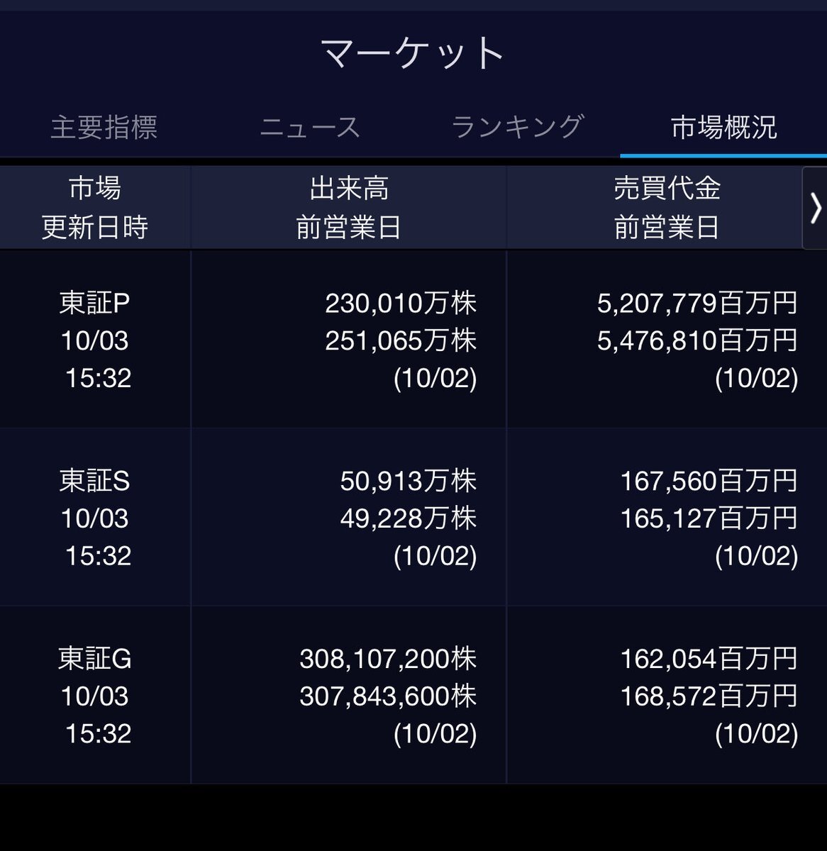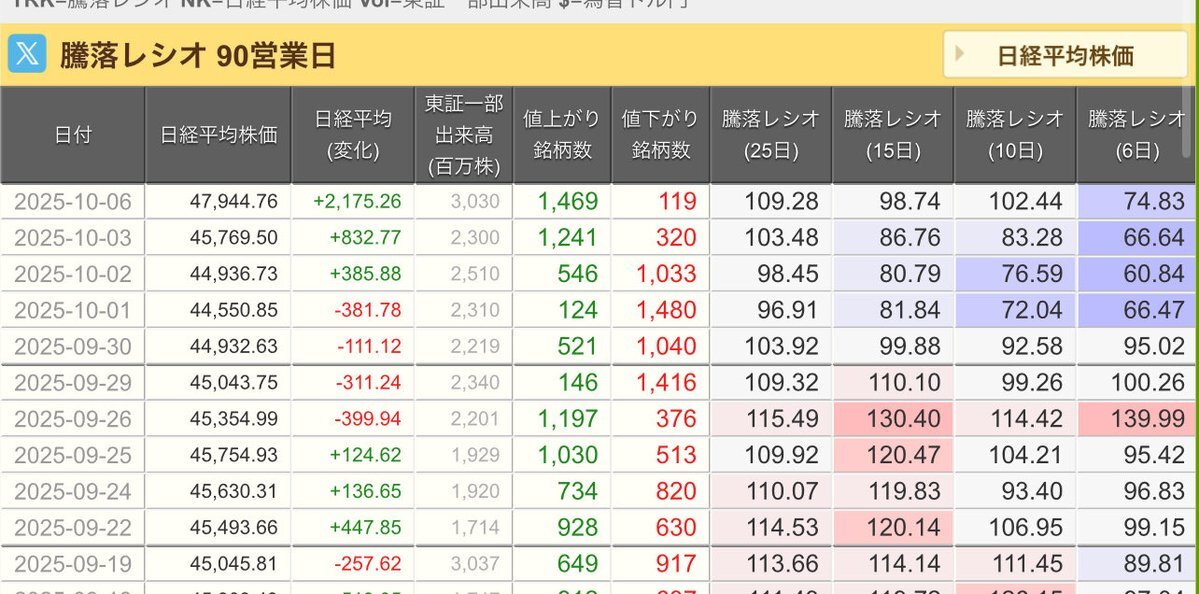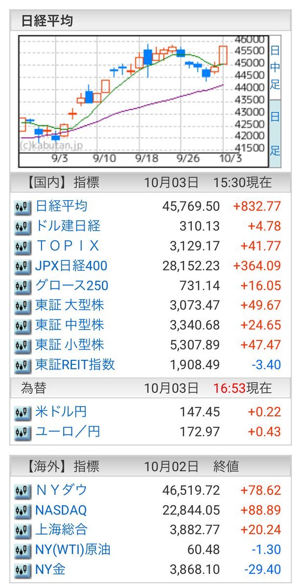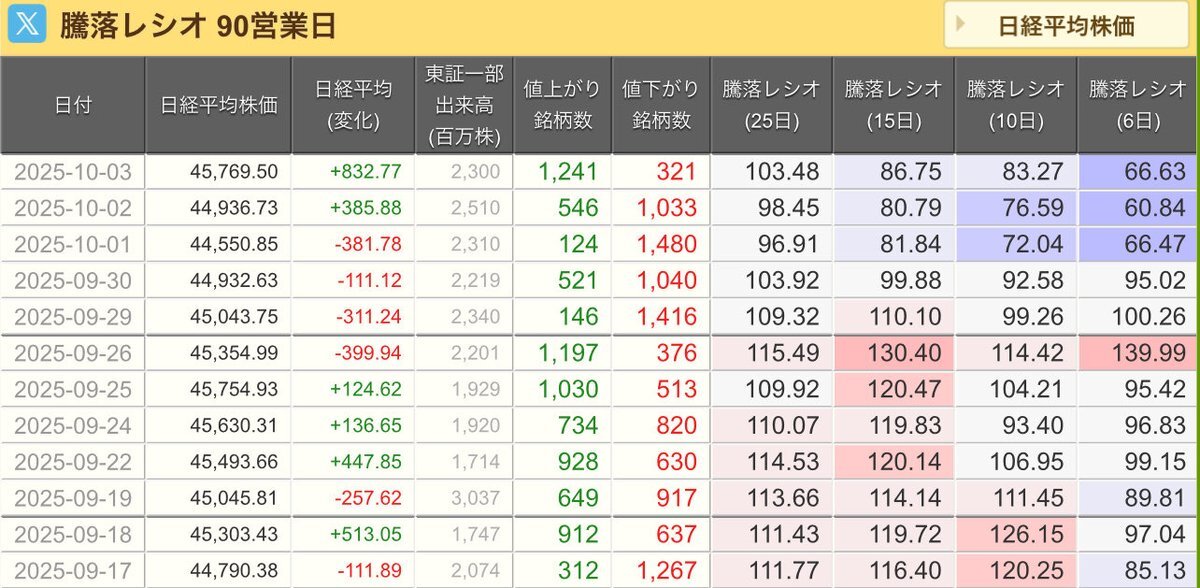 10/3(金)引け乙です🍄‍🟫 🇯🇵NK 45,769.50🔺+832.77 TOPIX 3,129.17🔺+41.77 グロース 731.14🔺+16.05 🔶売買代金 🔼値上がり数% P🔸5,207,779百万円🔼76% S🔸 167,560百万円🔼59% G🔸 162,054百万円🔼63% 騰落レシオ103.48⬜️⬜️⬜️🟦 #日本株 #株トレード #株式市場 pic.x.com/WxGYanknrT