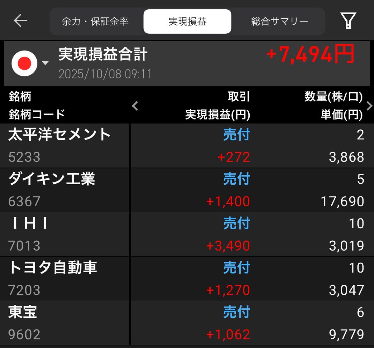 皆さま  おはようございます😃 《株式編》 本日の利益確定❣️ プラ転のミニ株を整理してみたよ。 #太平洋セメント #ダイキン工業 #IHI #トヨタ自動車 #東宝 #利益確定 #株トレード #ディナー代 pic.x.com/fOArtoC4FA