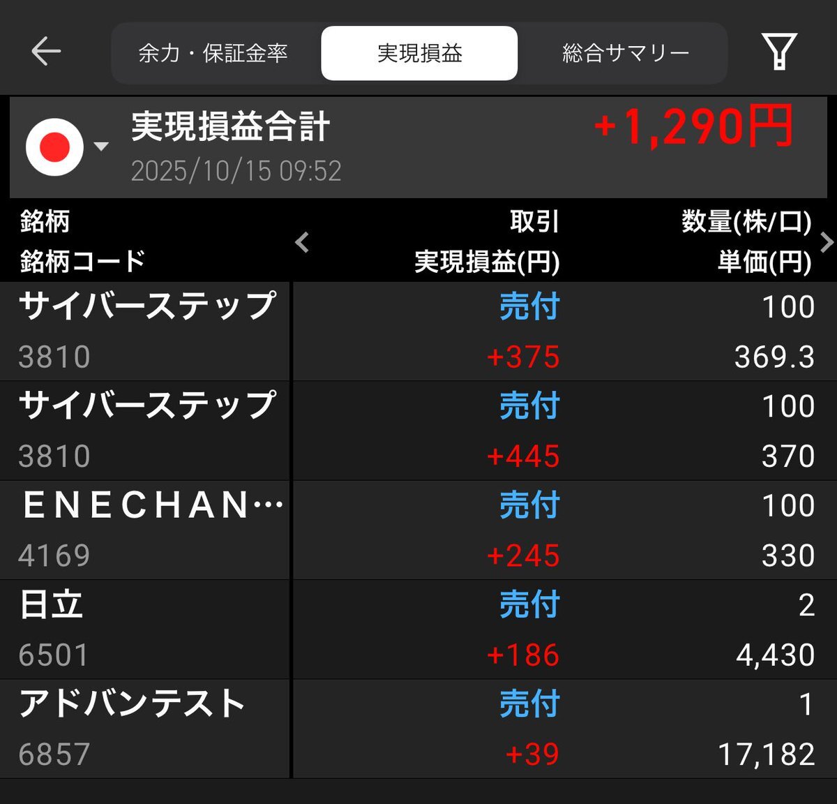 皆さま  おはようございます😃 《株式編》 本日の利益確定❣️ 10月は取りにくいね💦 細かく利益してみたよ。 #サイバーステップ #ENECHANGE #日立 #アドバンテスト #利益確定 #株トレード #ランチ代 pic.x.com/PYKc84VKCw