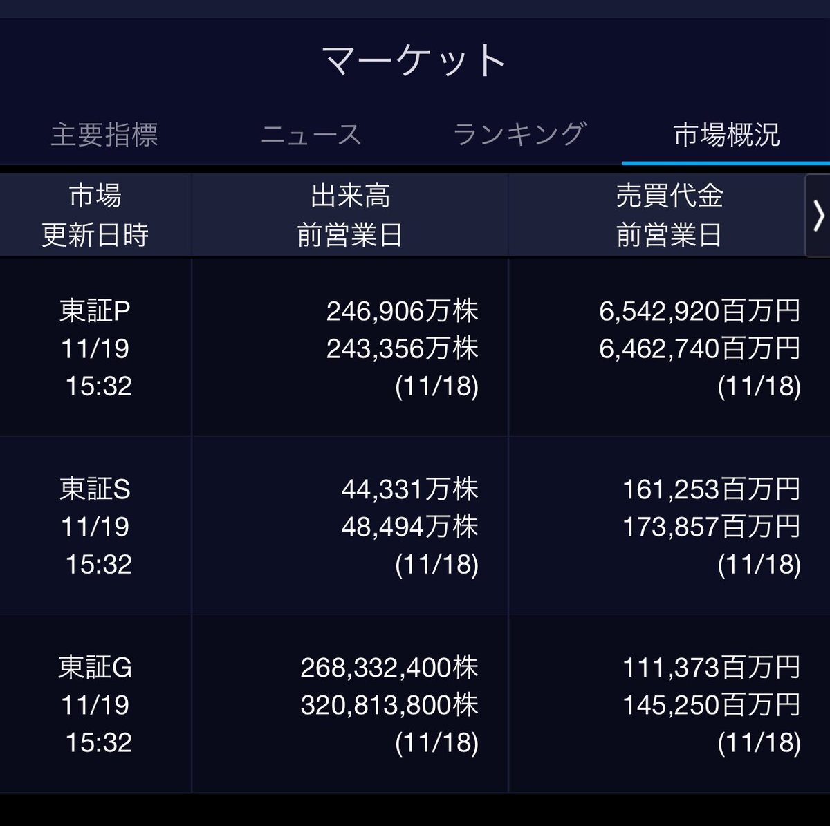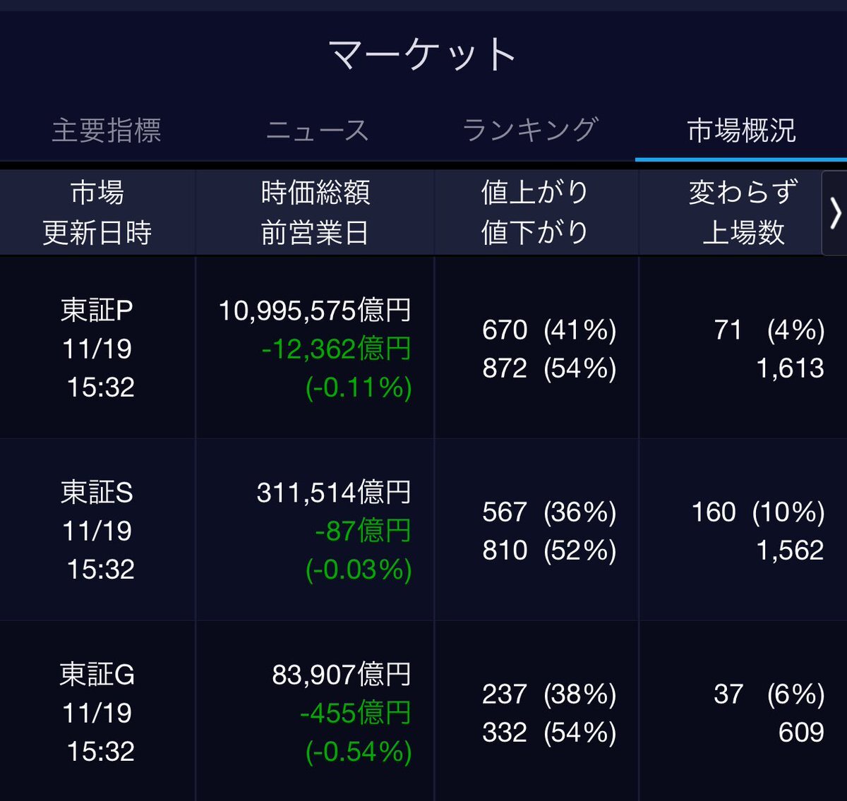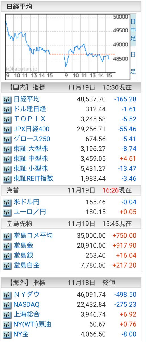 11/19(水)引け乙です🍁 🇯🇵NK 48,534.70🔹-165.28 TOPIX 3,245.58🔹-5.52 グロース 674.56🔹-5.41 🔶売買代金 🔼値上がり数% P🔸6,542,920百万円🔼41% S🔸 161,253百万円🔼36% G🔸 111,373百万円🔼38% 騰落レシオ115.95🟨⬜️⬜️⬜️ #日本株 #株トレード #株式市場 pic.x.com/NKU6D4HJuh