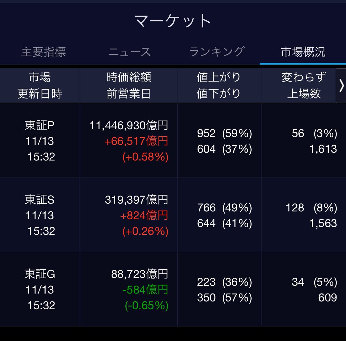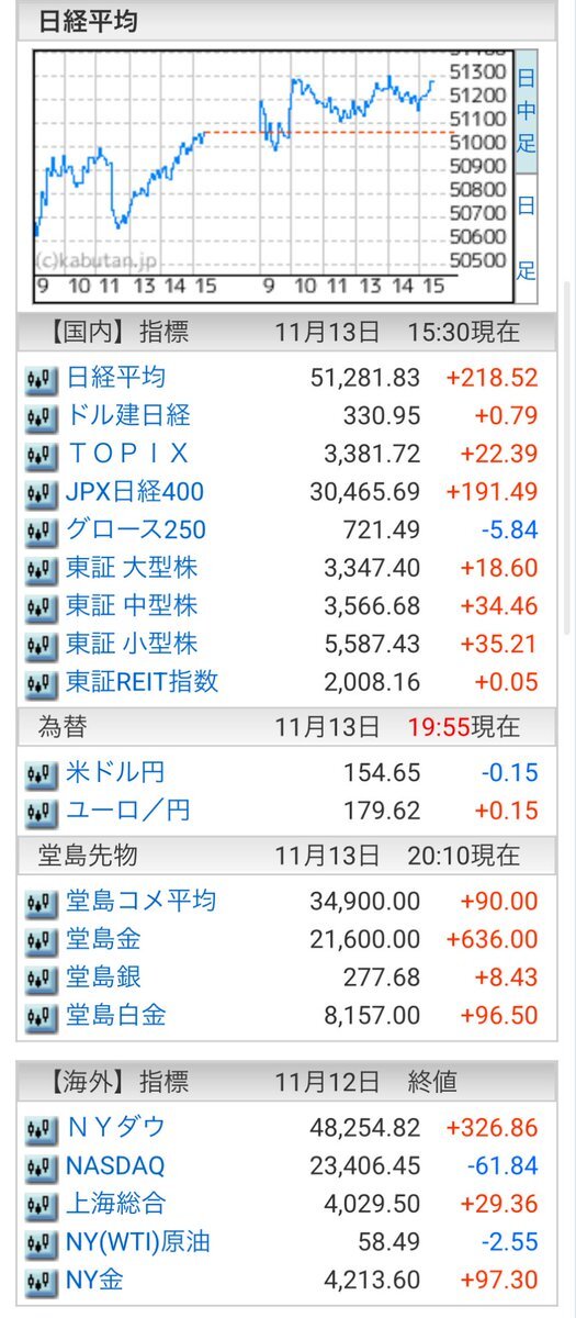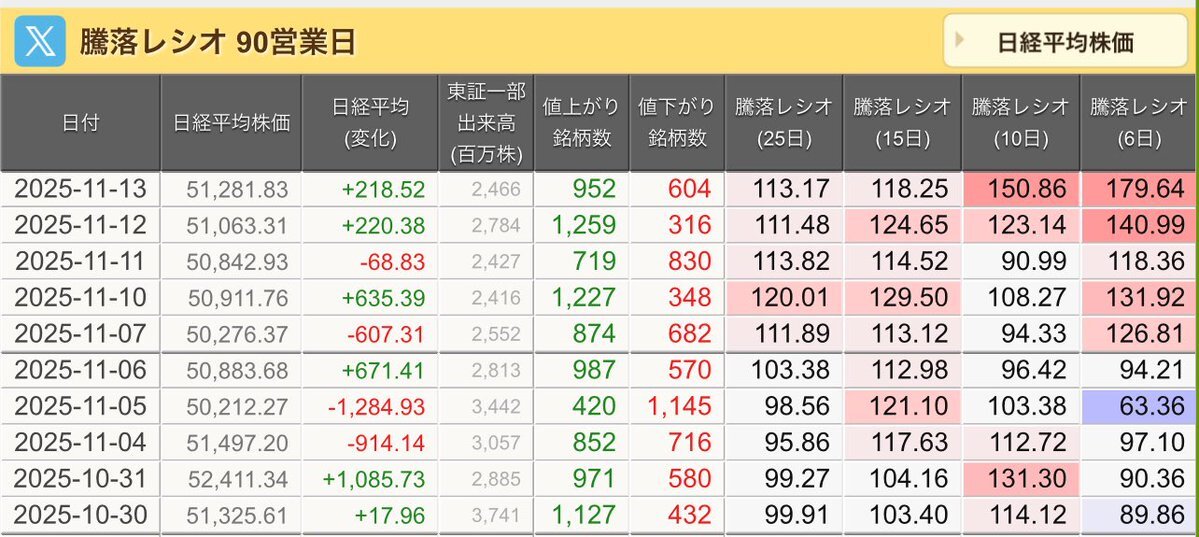 11/13(木)引け乙です🍁 🇯🇵NK 51,281.83🔺+218.52 TOPIX 3,381.72🔺+22.39 グロース 721.49🔹-5.84 🔶売買代金 🔼値上がり数% P🔸6,252,496百万円🔼59% S🔸 169,723百万円🔼49% G🔸 128,088百万円🔼36% 騰落レシオ113.17⬜️⬜️🟥🟥 #日本株 #株トレード #株式市場 pic.x.com/rXQh82bHlP