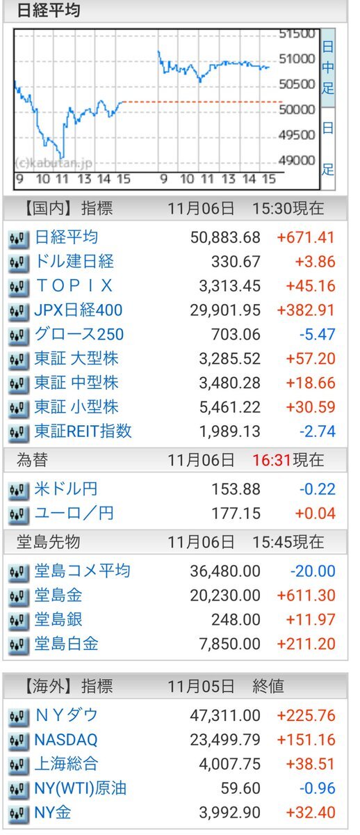 11/6(木)引け乙です🍁 🇯🇵NK 50,883.68🔺+671.41 TOPIX 3,313.45🔺+45.16 グロース 703.06🔹-5.47 🔶売買代金 🔼値上がり数% P🔸6,904,030百万円🔼61% S🔸 151,490百万円🔼58% G🔸 106,742百万円🔼49% 騰落レシオ103.38⬜️🟨⬜️⬜️ #日本株 #株トレード #株式市場 pic.x.com/3UViPUvxaH