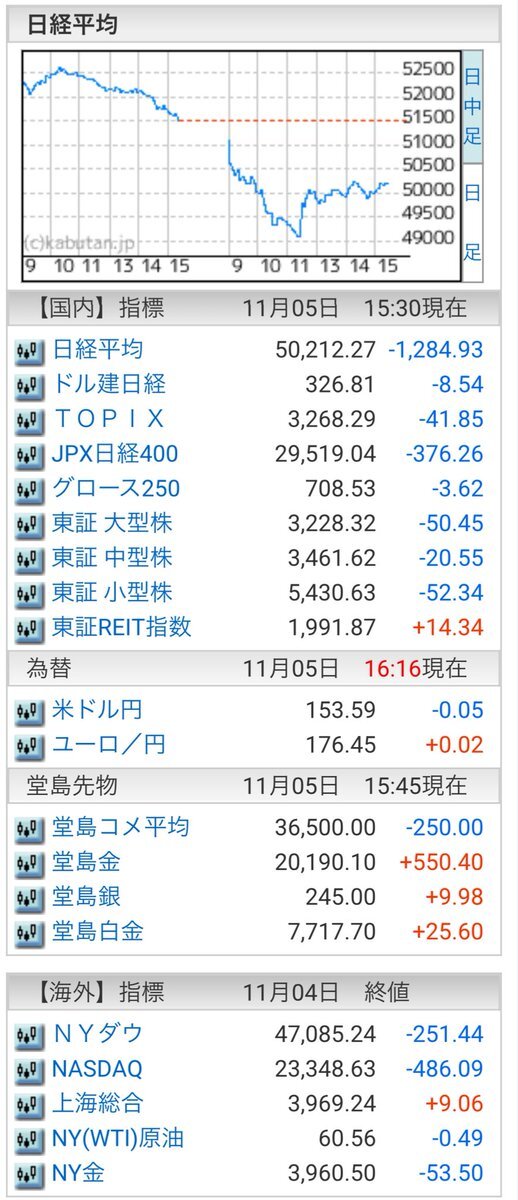 11/5(水)引け乙です🍁 🇯🇵NK 50,212.27🔹-1,284.93 TOPIX 3,268.29🔹-41.85 グロース 708.53🔹-3.62 🔶売買代金 🔼値上がり数% P🔸8,704,455百万円🔼52% S🔸 182,130百万円🔼42% G🔸 106,264百万円🔼35% 騰落レシオ98.56⬜️🟧⬜️🟩 #日本株 #株トレード #株式市場 pic.x.com/SDM2rCktqr