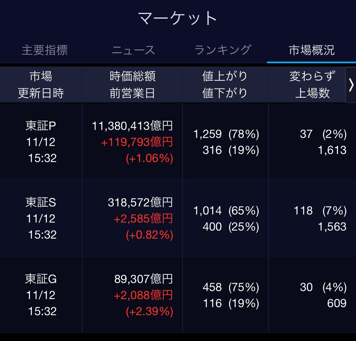 11/12(水)引け乙です🍁 🇯🇵NK 51,063.31🔺+220.38 TOPIX 3,359.33🔺+37.75 グロース 727.33🔺+17.59 🔶売買代金 🔼値上がり数% P🔸7,000,596百万円🔼78% S🔸 149,327百万円🔼65% G🔸 123,634百万円🔼75% 騰落レシオ111.49⬜️🟧🟧🟥 #日本株 #株トレード #株式市場 pic.x.com/D8pcVaCEYj