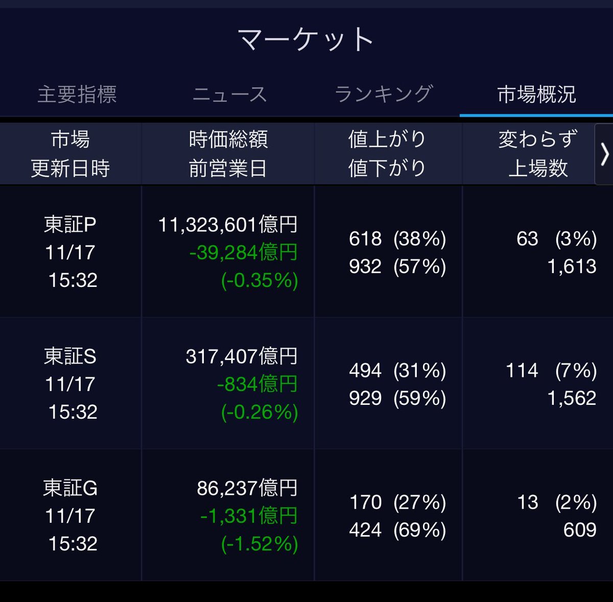 11/17(月)引け乙です🍁 🇯🇵NK 50,323.91🔹-52.62 TOPIX 3,347.53🔹-12.28 グロース 698.53🔹-10.01 🔶売買代金 🔼値上がり数% P🔸6,187,363百万円🔼38% S🔸 179,721百万円🔼31% G🔸 152,239百万円🔼27% 騰落レシオ110.31⬜️⬜️🟧🟥 #日本株 #株トレード #株式市場 pic.x.com/0O49XnfXXQ