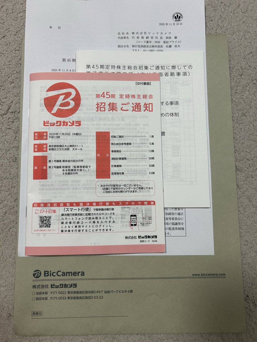 🏢株主総会 ビックカメラ(3048) 駅周辺に店舗展開している来店しやすい大手家電量販店。株式投資を始めた時から所有している思い出深い銘柄。総会は今回初参加。 小売り企業にありがちな店舗クレームに関する質問が多かった。経営全般に関する質問をしてほしいな🙋 #ビックカメラ #株主総会 pic.x.com/SKo6PFjoyb