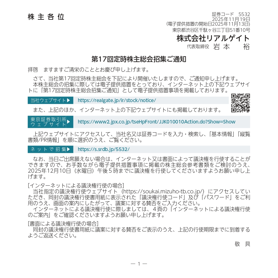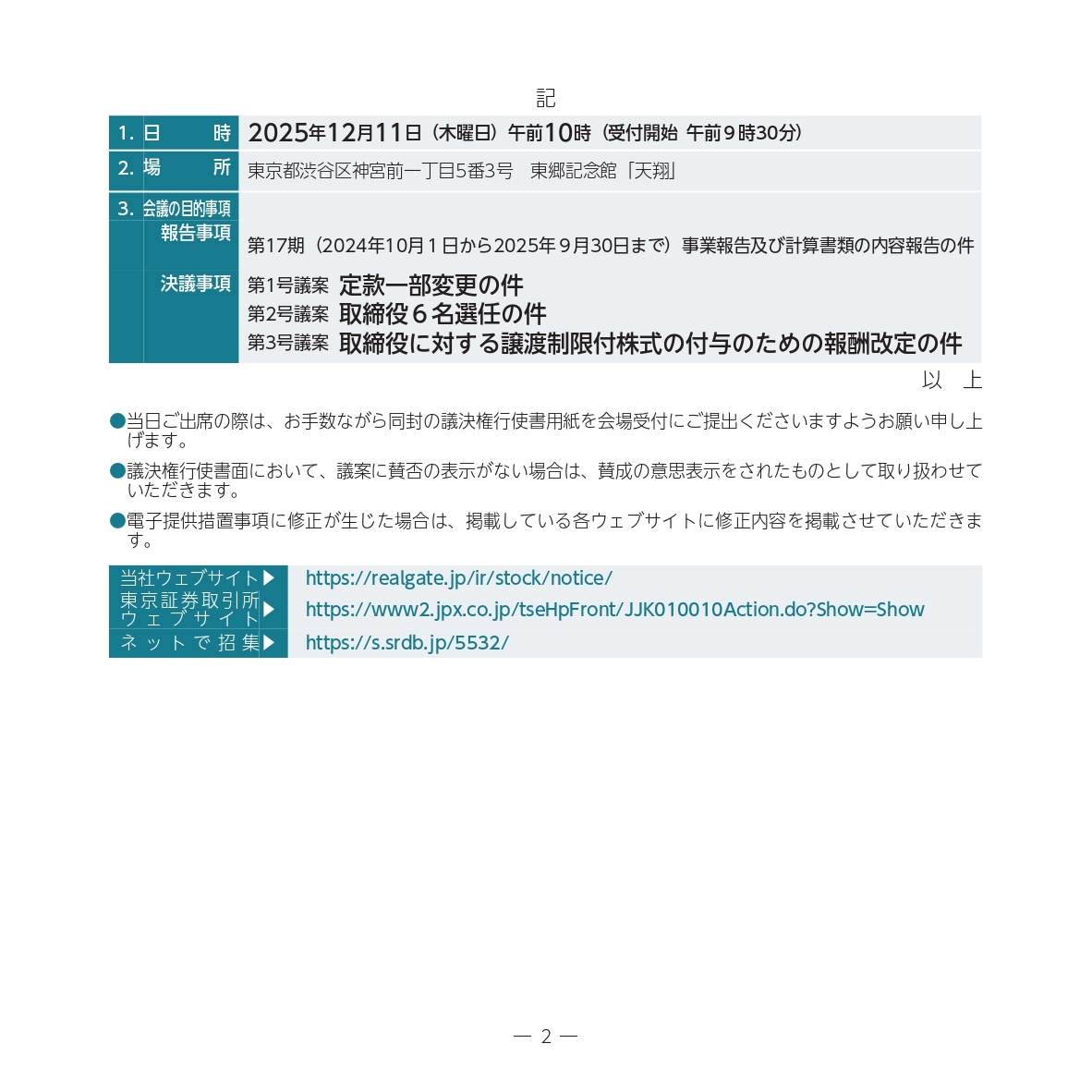 第17回定時株主総会の招集通知を公開いたしました。 日時:2025年12月11日(木)午前10時開始 場所:東郷記念館「天翔」東京都渋谷区神宮前一丁目5番3号 realgate.jp/ir/upload_file… #リアルゲイト #株主総会 pic.x.com/obEY6pJbRU