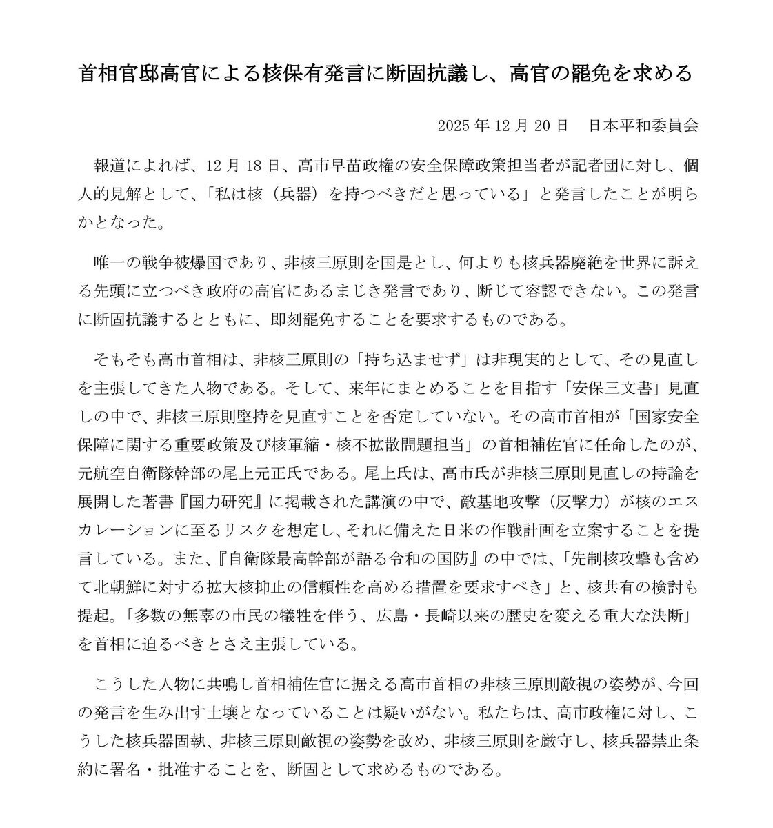 首相官邸高官による核保有発言に断固抗議し、高官の罷免を求める声明を出しました。 高市首相の #非核三原則 敵視の姿勢が、今回の発言を生み出す土壌となっています。高市政権は核兵器固執の姿勢を改め、非核三原則を厳守し、#核兵器禁止条約 に署名・批准することを断固として求めます。
