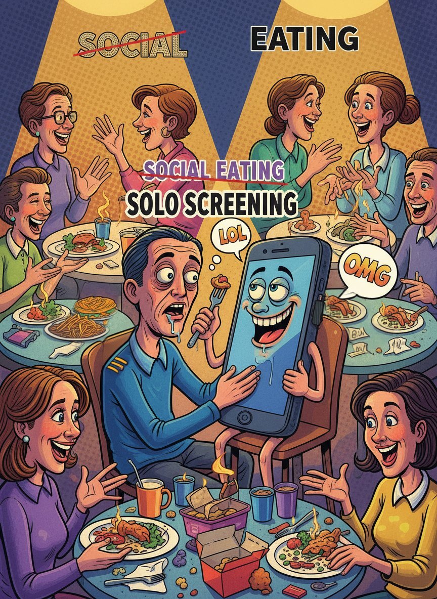 Title: 一緒に食べてるのは“誰”ですか? #オリジナル風刺画EP16 食事中もスマホを手放せない現代を表現してみました! #風刺画 #スマホ依存 #イラスト #格差社会 #PhoneAddiction #SmartphoneAddiction #ScreenAddiction #DigitalAddiction pic.x.com/GpmjVf3vcg