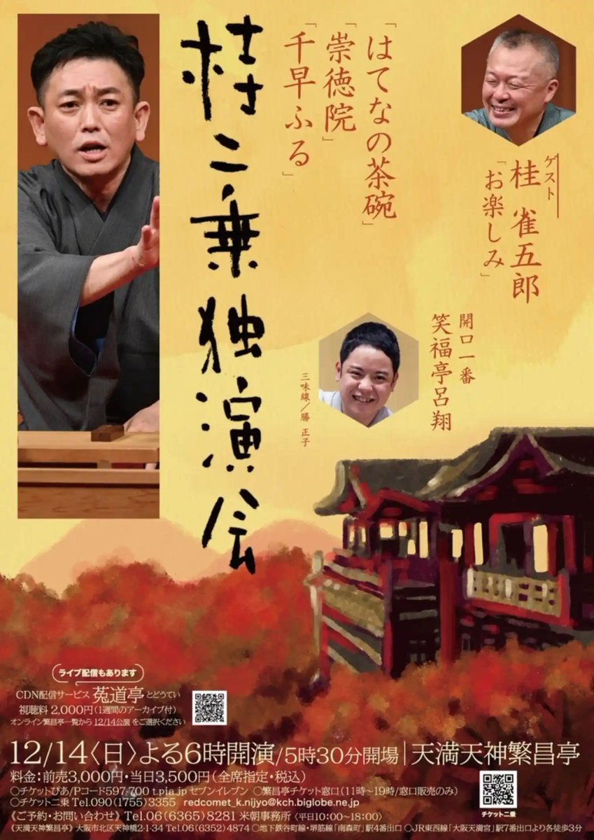\ 落語を楽しむのも #Sonoligo 🍂/ 米朝事務所 桂二乗独演会 2025年12月14日(日)開催✨ よる6時開演です🥰 『はてなの茶碗』『崇徳院』『千早ふる』#桂二乗 「お楽しみ」#桂雀五郎(ゲスト) 「開口一番」#笑福亭呂翔 buff.ly/Bz16vOL #イベントのサブスク #2980円で参加し放題 pic.x.com/2ZKxCPKitx