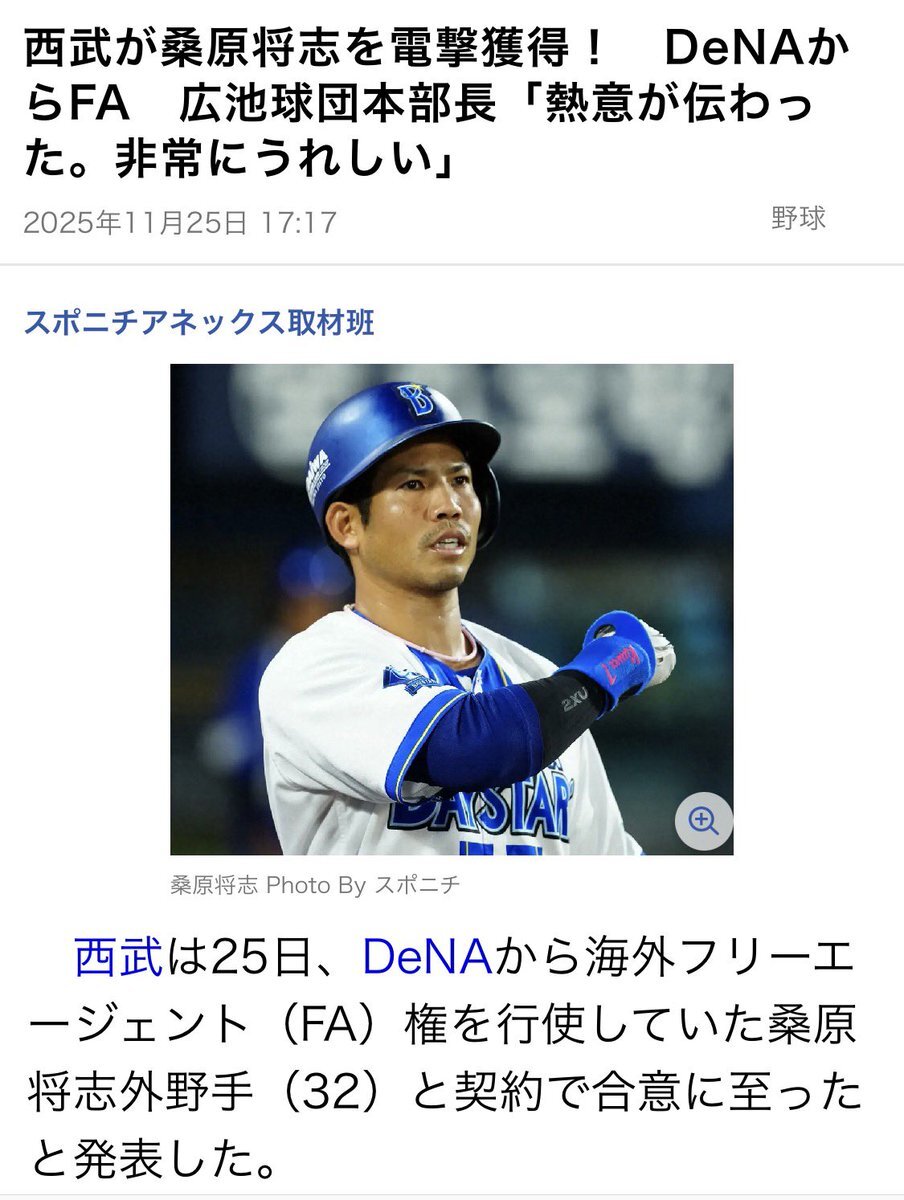 これは驚いた!!!!😮!! 予想外すぎた #ベイスターズ #桑原 西武が桑原将志獲得 DeNAからFA #Yahooニュース approach.yahoo.co.jp/r/SwgTLr?src=h…