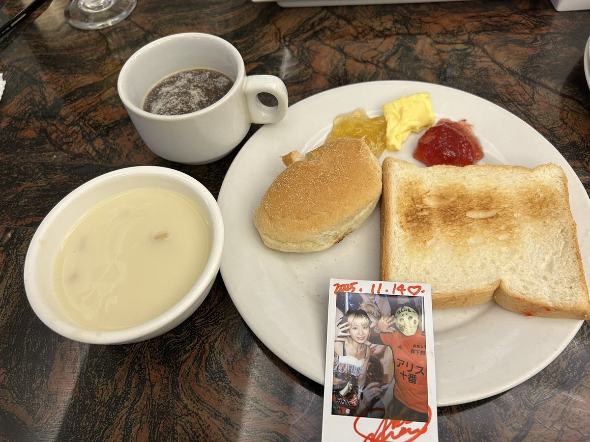 はんべえの冬休み13 チェキ飯🍞 2日目のホテルの朝食です。 クリームスープとオムレットが美味しかったです。 ねおさんとヲタクの話しで盛り上がりました😄 #ホテル朝食 #オムレット #仮面女子 #森下舞桜 pic.x.com/RRSsxx7Quf
