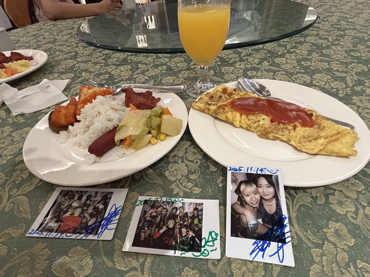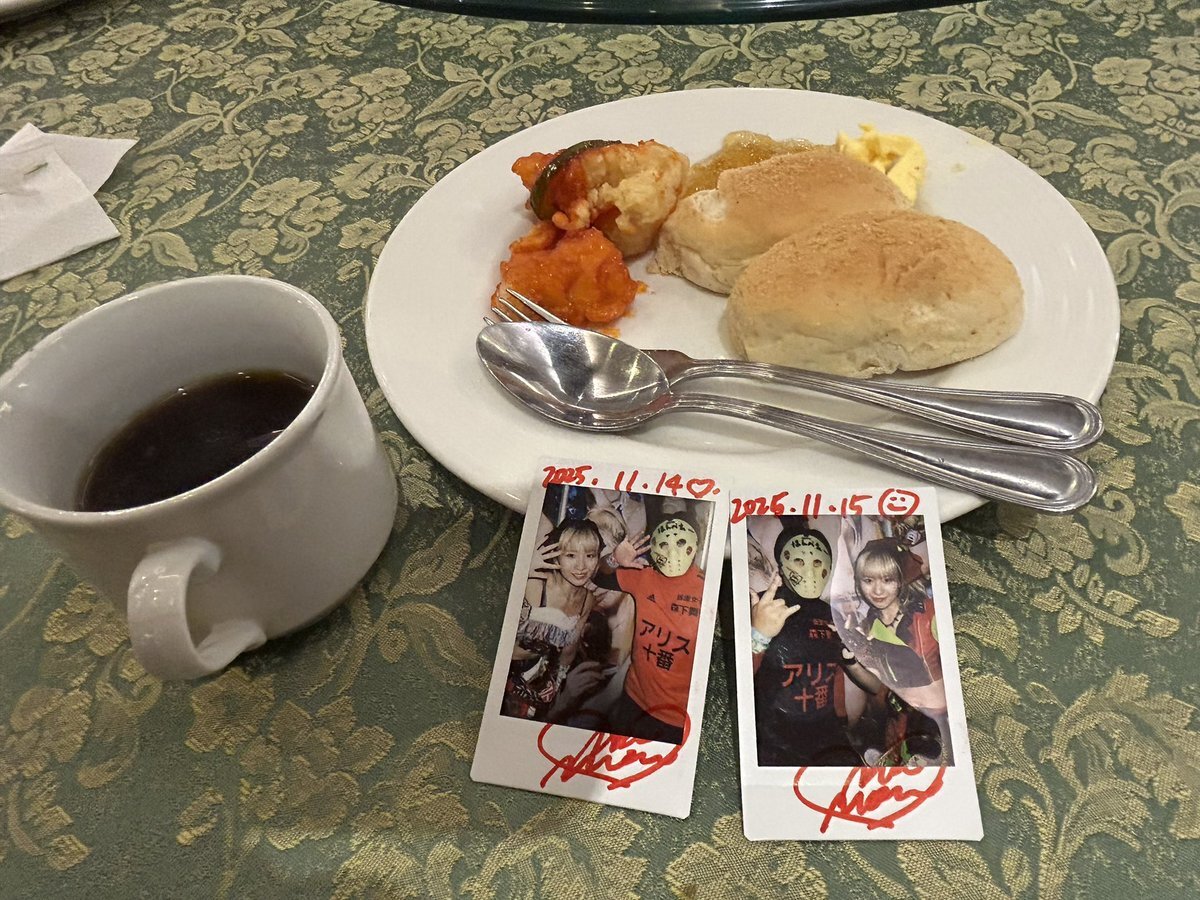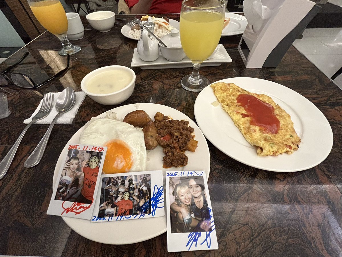 はんべえの冬休み25 チェキ飯🇵🇭 フィリピン遠征最終日のホテルの朝食です🍞 前日と少しメニューが変わってました。できたてのオムレットと白身魚のフライが美味しかったです。 ごちそうさまでした😋 #チェキ飯 #ホテルの朝食 #仮面女子 #森下舞桜 #涼邑芹 pic.x.com/xRAaV31z2B