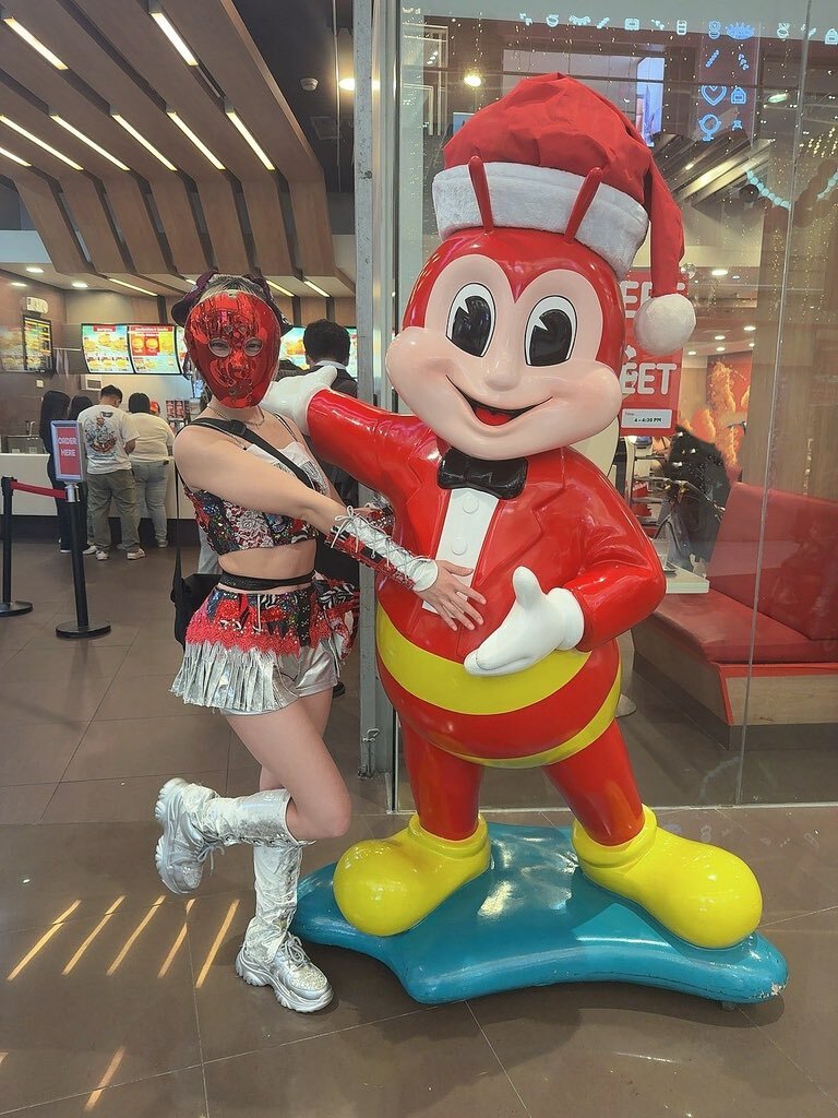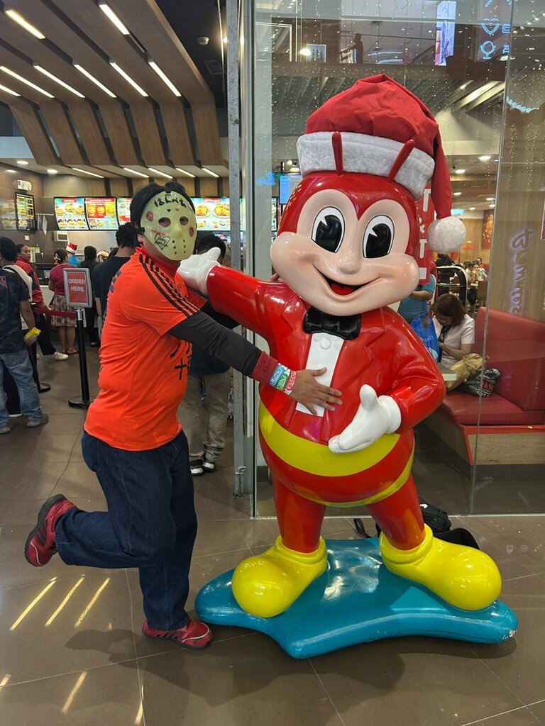 はんべえの冬休み10 jollibee君?で推しメンと同じポーズをしました‼️ 体が太いのは目をつぶって下さい🙇 僕としてはなかなかの出来だと思います😄笑 #jollibee #推しメンと同じポーズ #マニラ #森下舞桜 #仮面女子 pic.x.com/dPLmyh6awR