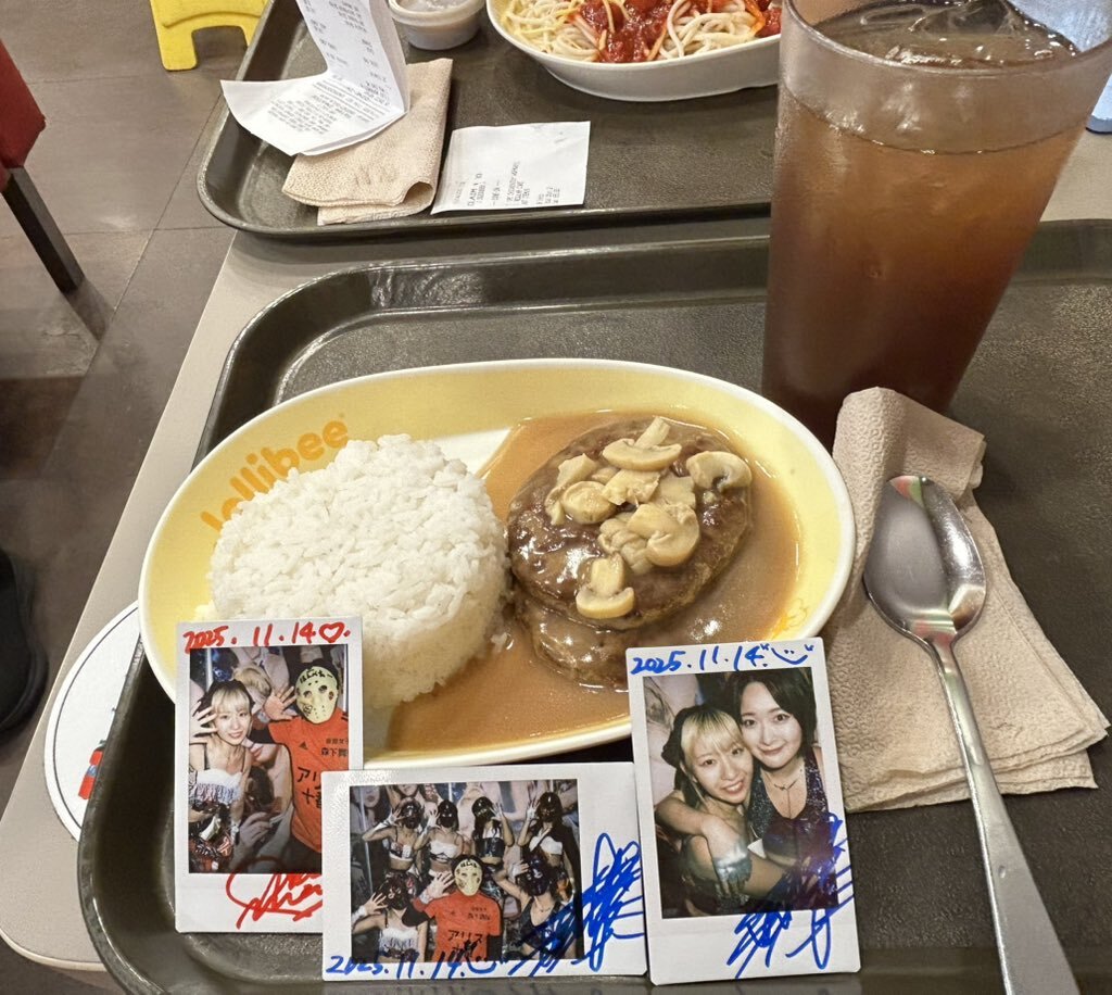 はんべえの冬休み12 チェキ飯🇵🇭 ライブ後にみんなでjollibeeで食事しました。 ハンバーグセットです。 飲み物はレモンティーです🍋 給食を思い出しました。 ハンバーグセット 193ペソ #jollibee #ハンバーグセット #仮面女子 #森下舞桜 #涼邑芹 pic.x.com/U01GkchOrL