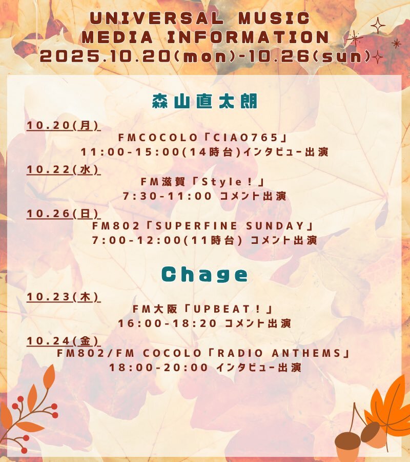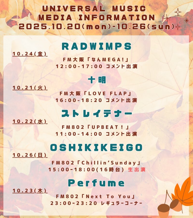-`📢⋆10/20(mon.)〜10/26(sun.) ===関西圏メディア出演情報=== #森山直太朗 #Chage #RADWIMPS #十明 #ストレイテナー #OSHIKIKEIGO #Perfume pic.x.com/Ja1tr16req