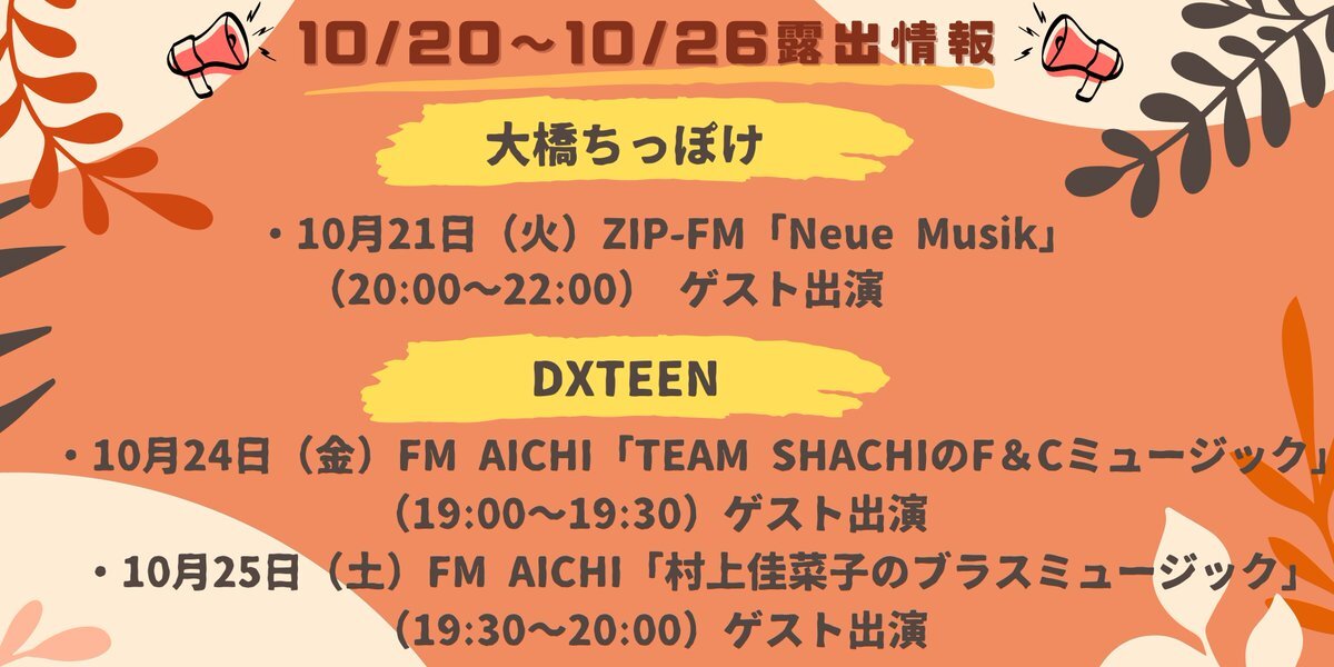 / 🔶東海・北陸地区 10/20〜10/26🔶 📻今週のアーティスト出演情報📺 \ #大橋ちっぽけ #DXTEEN #十明 #森山直太朗 『ユニバーサル ミュージック Nagoya 』 是非、フォローをお願い致します ‼️ 詳しい情報は⬇️ pic.x.com/KW8p6QvT7W