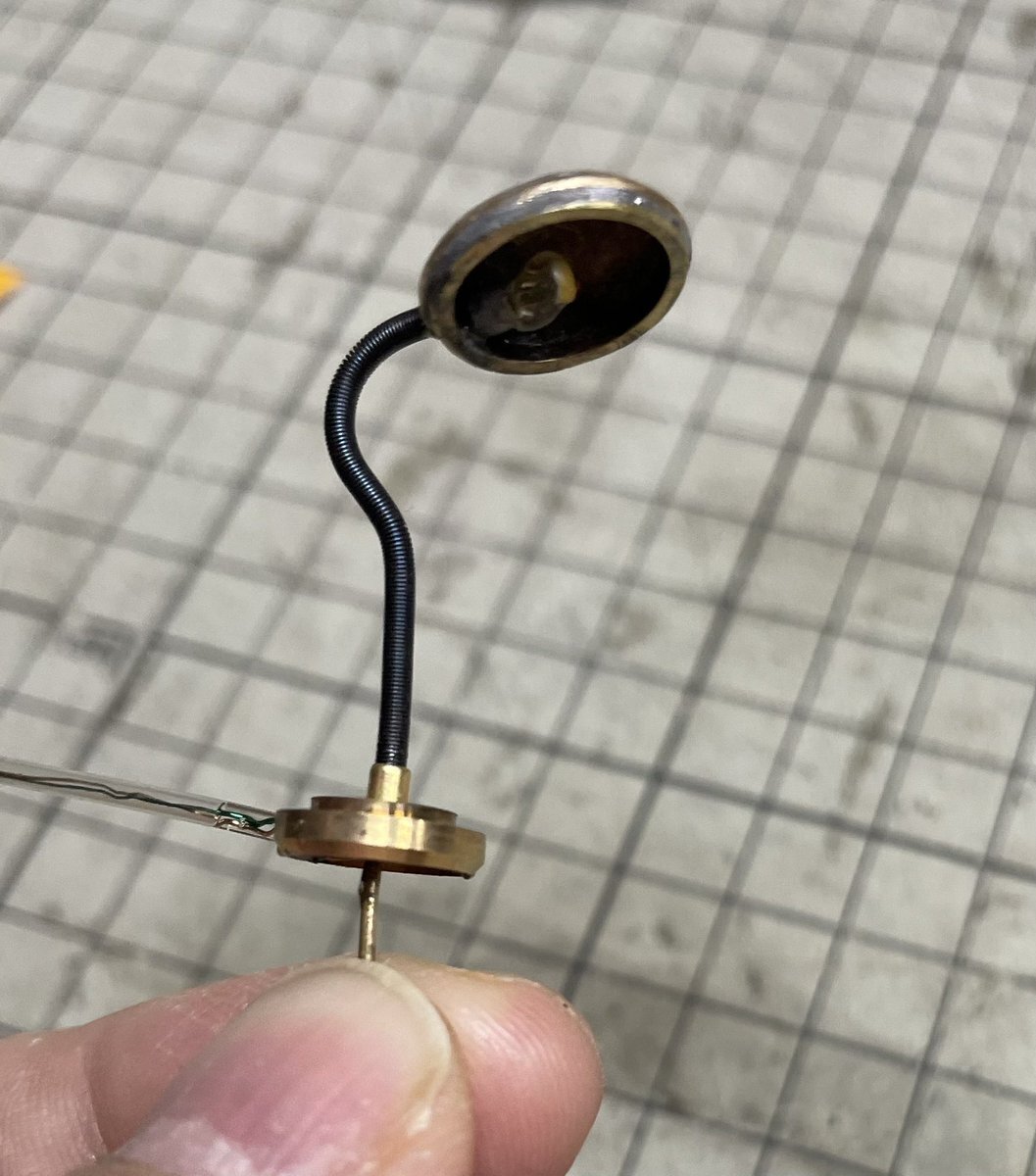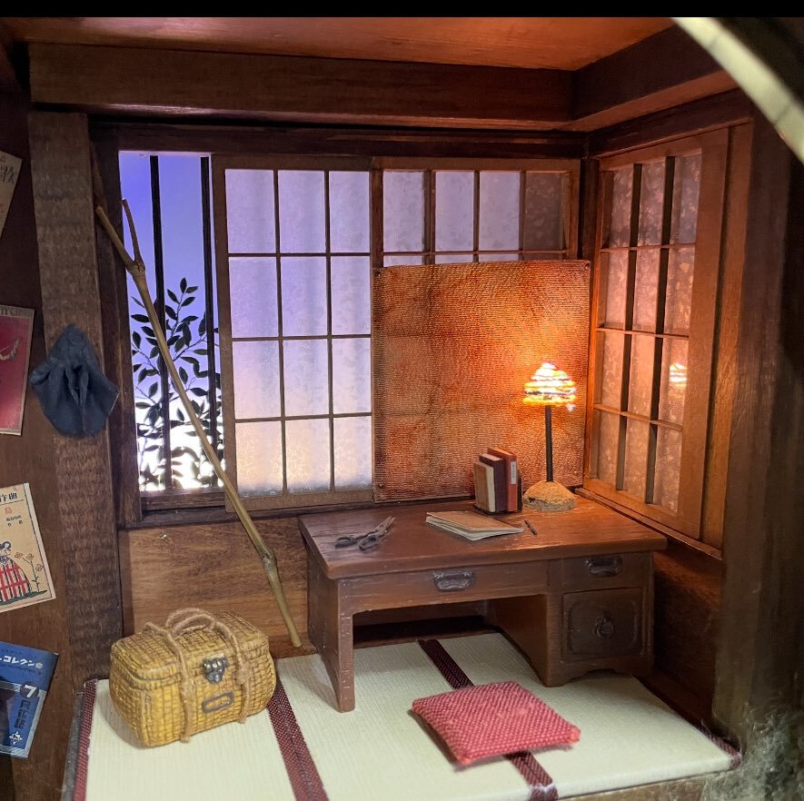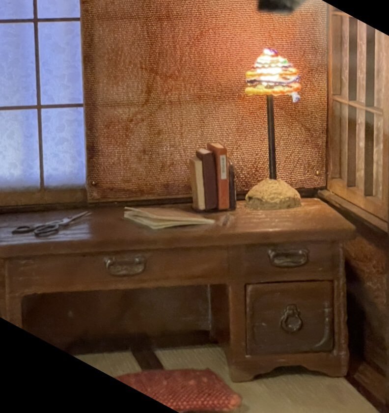 改良点。二助の部屋の電気スタンド。前回机の上に設置したのは灯りの点かないダミーだったのをLEDを仕込んで光るようにしました。 #尾崎翠 #第七官界彷徨 #模型 #ミニチュア #情景作品 #渋谷クラフト倶楽部 #はがいちよう #芳賀一洋 #東京交通会館 pic.x.com/pobr6RPriv