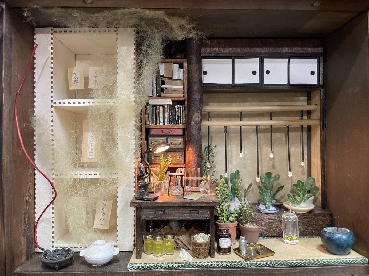 「そのために彼は音楽予備校を二日休み、粘土こねに熱中した。彼は女中部屋でその仕事をしたので、そのあいだ私は女中部屋で針金に糸をあみつけた不出来な電気笠を二つ作った。」 #尾崎翠 #第七官界彷徨 #模型 #ミニチュア #情景作品 #渋谷クラフト倶楽部 #はがいちよう #芳賀一洋 #東京交通会館 pic.x.com/aDm1ABJl93