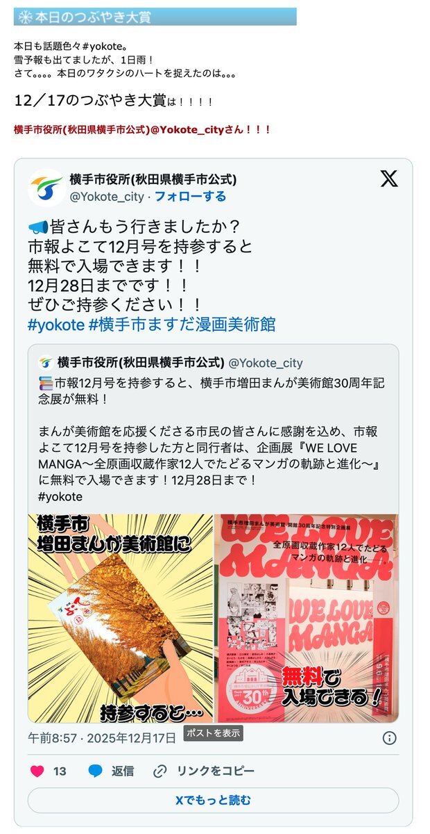 📣皆さんもう行きましたか? 市報よこて12月号を持参すると 無料で入場できます!! 12月28日までです!! ぜひご持参ください!! #yokote #横手市ますだ漫画美術館 x.com/yokote_city/st…