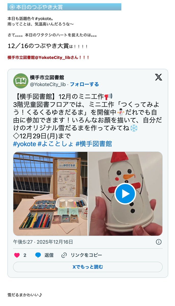雪だるまかわいい♪ #yokotter スタッフブログ更新!人気ブログランキングボタンをポチックリックよろしくです!! acotan28.seesaa.net #yokote #y_blog #横手 #秋田 #asago pic.x.com/2onVTwxdUz