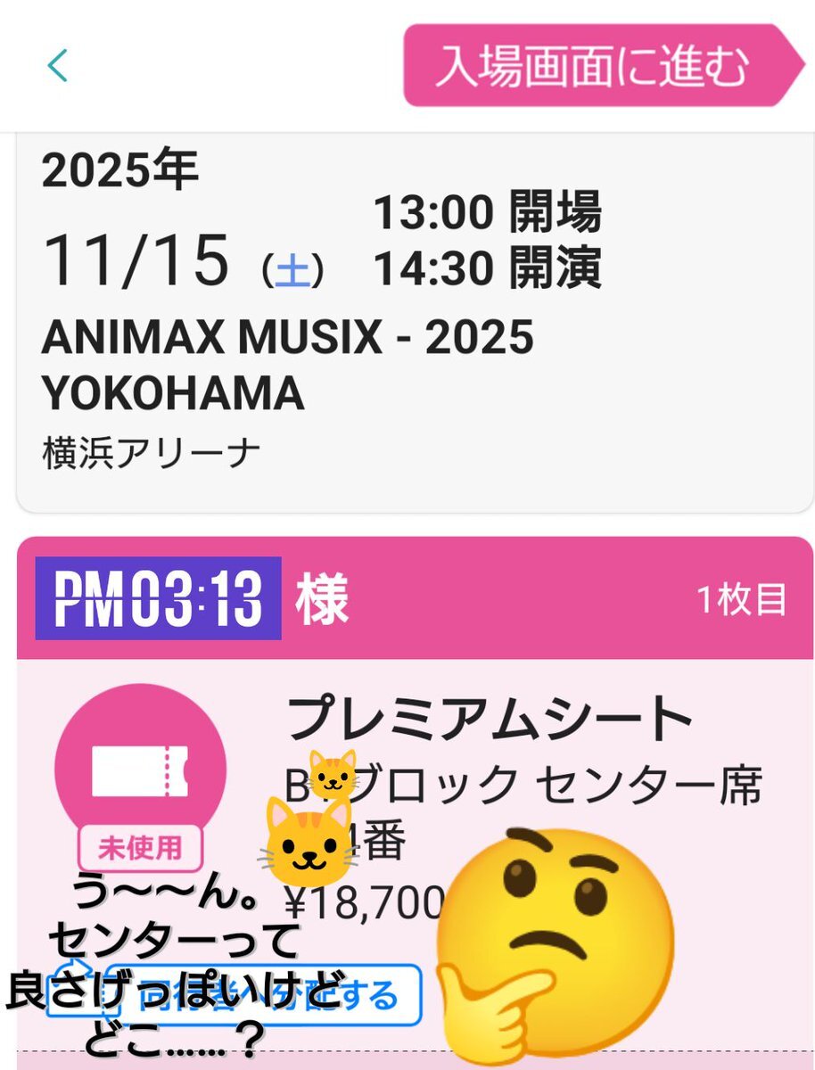 発券されました🙂↕️ ANIMAXのみならず毎回アリーナ席って、記載されているアルファベットと席番を鵜呑みにできなさ過ぎて逆に不安😨 2023年のANIMAXみたいに奈央ちゃんが後ろから登場する場合があるから出てくるまで本当の当たり席か分かんないね😮💨 #ANIMAXMUSIX2025 #横浜アリーナ #東山奈央 pic.x.com/IjgbafjNMm
