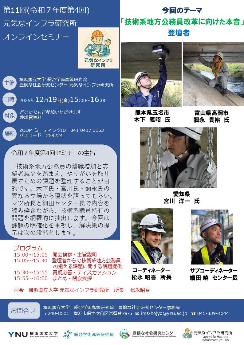 第11回元気なインフラ研究所公開セミナー(オンライン・無料) #元気なインフラ研究所 #横浜国立大学 #総合学術高等研究院 #豊穣な社会研究センター #熊本県玉名市 #富山県高岡市 #愛知県 pic.x.com/dhoZAwiPjd