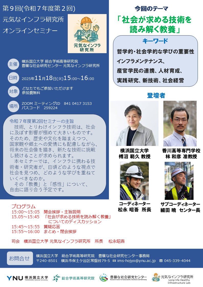 第9回元気なインフラ研究所公開セミナー(オンライン・無料) #元気なインフラ研究所 #横浜国立大学 #総合学術高等研究院 #豊穣な社会研究センター #香川高専 pic.x.com/omhustfp4G