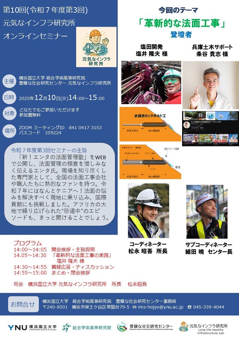 第10回元気なインフラ研究所公開セミナー(オンライン・無料) #元気なインフラ研究所 #横浜国立大学 #総合学術高等研究院 #豊穣な社会研究センター #エンタ さん #ジョウ所長 pic.x.com/jC1GI77A9D