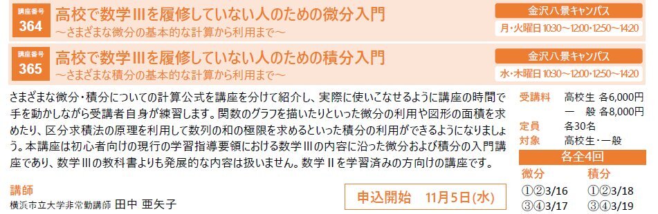 📢2025年度後期高校生向け講座をご紹介📢「高校で数IIIを履修していない人のための微分入門・積分入門」申込受付中‼️👉 ssl.smart-academy.net/ycu/course/det… ssl.smart-academy.net/ycu/course/det… 数学IIを学習済みの方向けで、大学入学前に基本を確認できます。 先着順‼️ #横浜市立大学 #エクステンション講座 #YCU pic.x.com/dxGq1ccL2v