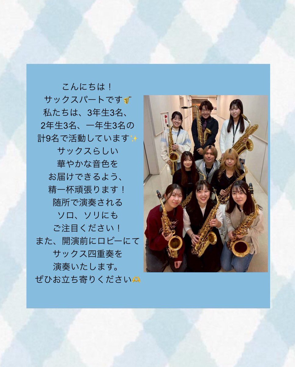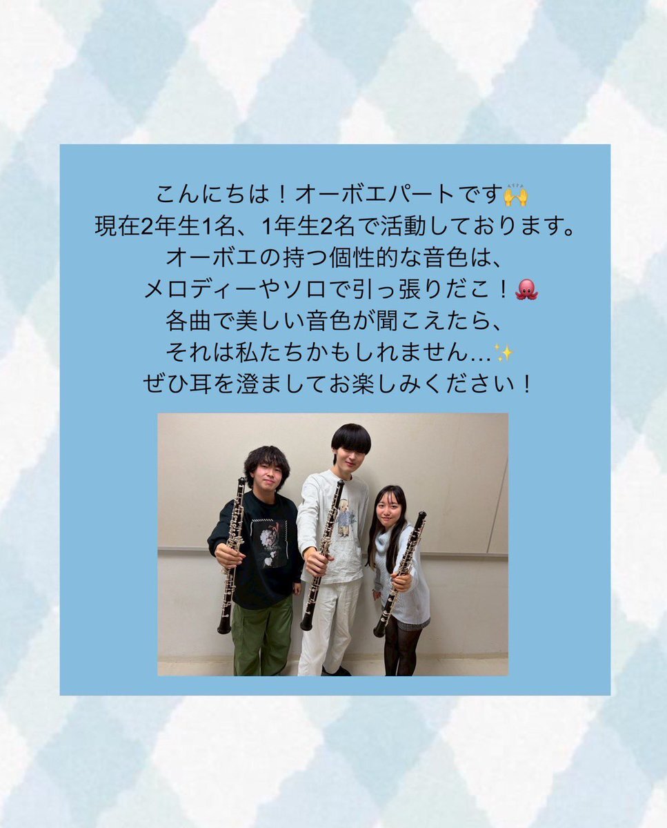 こんにちは!吹奏楽団「奏」です⛄️❄️ 本日はsaxとoboeのパート紹介です🎶 定期演奏会のお知らせ📢 12/27(土) 13:00開場 13:30開演 港南公会堂 入場料無料 #横浜市立大学 #ycu #吹奏楽 pic.x.com/a2tex39omo
