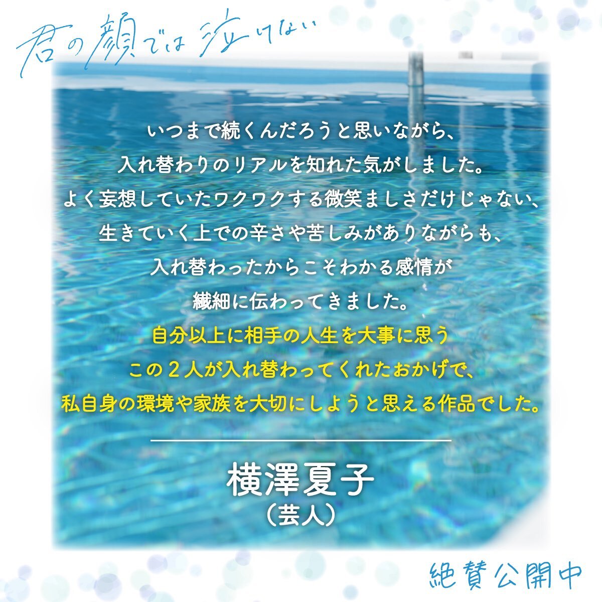 #君の顔では泣けない感想 コメントが届きました📝 ⋱ 自分以上に相手の人生を大事に思う この2人が入れ替わってくれたおかげで、 私自身の環境や家族を大切にしようと思える作品でした。 #横澤夏子 (芸人) ━━━━━━━ ・・・ @45sawa72 #君の顔では泣けない #きみなけ 全国上映中 pic.x.com/tATt2YwYX2