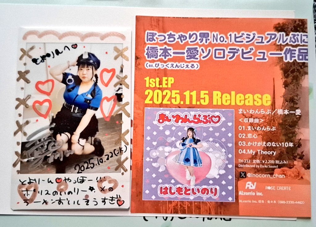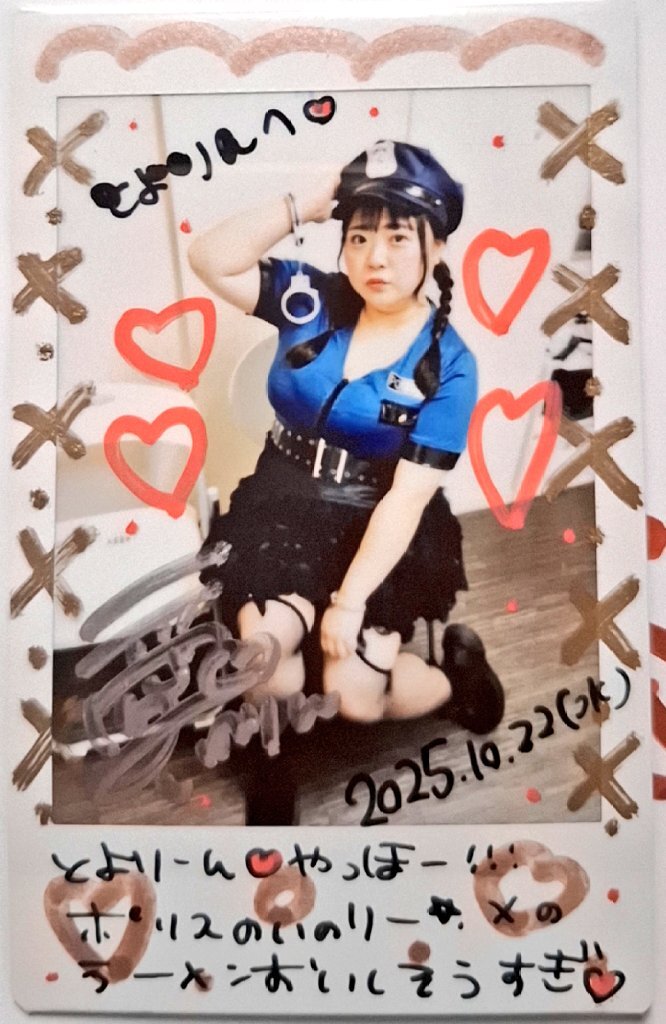 ポリスないのりんの 👻チェキが届きました🎃 ポリス姿も決まってて可愛い🥰👮 あのラーメンおいしかった🍜 サインもありがとう CDが手元に届くのも楽しみ #いのこんにちは #橋本一愛 pic.x.com/QEuJtpNAiV