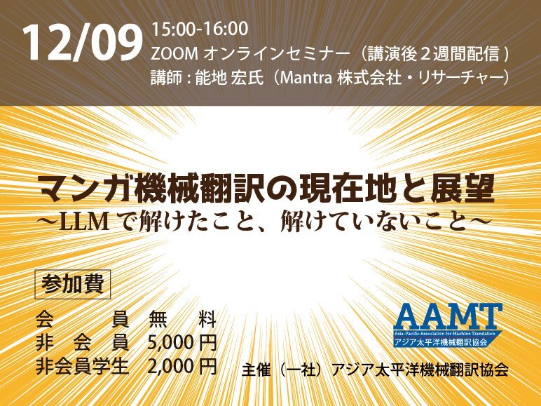 第17回AAMTセミナーでは、漫画翻訳での機械翻訳の実用について解説します。 詳細👉aamt.info/event/seminar/… 申し込み👉app.payvent.net/embedded_forms… #機械翻訳 #AI #漫画翻訳 #コミック pic.x.com/MWd2221GbX