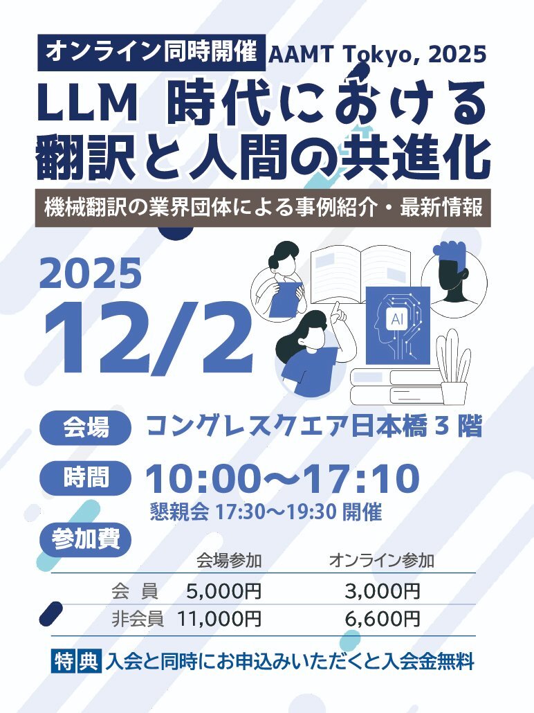 #AAMT2025Tokyo 開催決定! 📅 2025年12月2日(火)10:00~17:10(懇親会あり) 📍 コングレスクエア日本橋(東京メトロ日本橋駅直結) 💻 ハイブリッド開催(Zoom配信&会場開催) 【内容】 - パネルディスカッション:MT×PEの実務活用 ほか  学生ご招待  #生成AI #機械翻訳 #翻訳 pic.x.com/G0BUjVAmMk