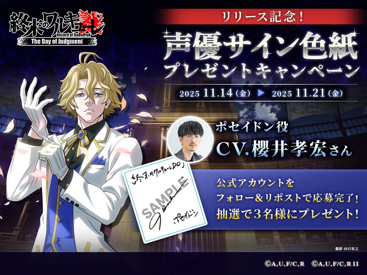 🔥フォロー&RPキャンペーン🔥 🎁応募方法🎁 ①当アカウントをフォロー ②本ポストをRP 抽選で3名様に ポセイドン役 #櫻井孝宏 さん 直筆サイン色紙プレゼントです🌟 #終末のワルキューレ #終末のワルキューレDOJ #終ワルDOJ pic.x.com/ozuIpMjsDy
