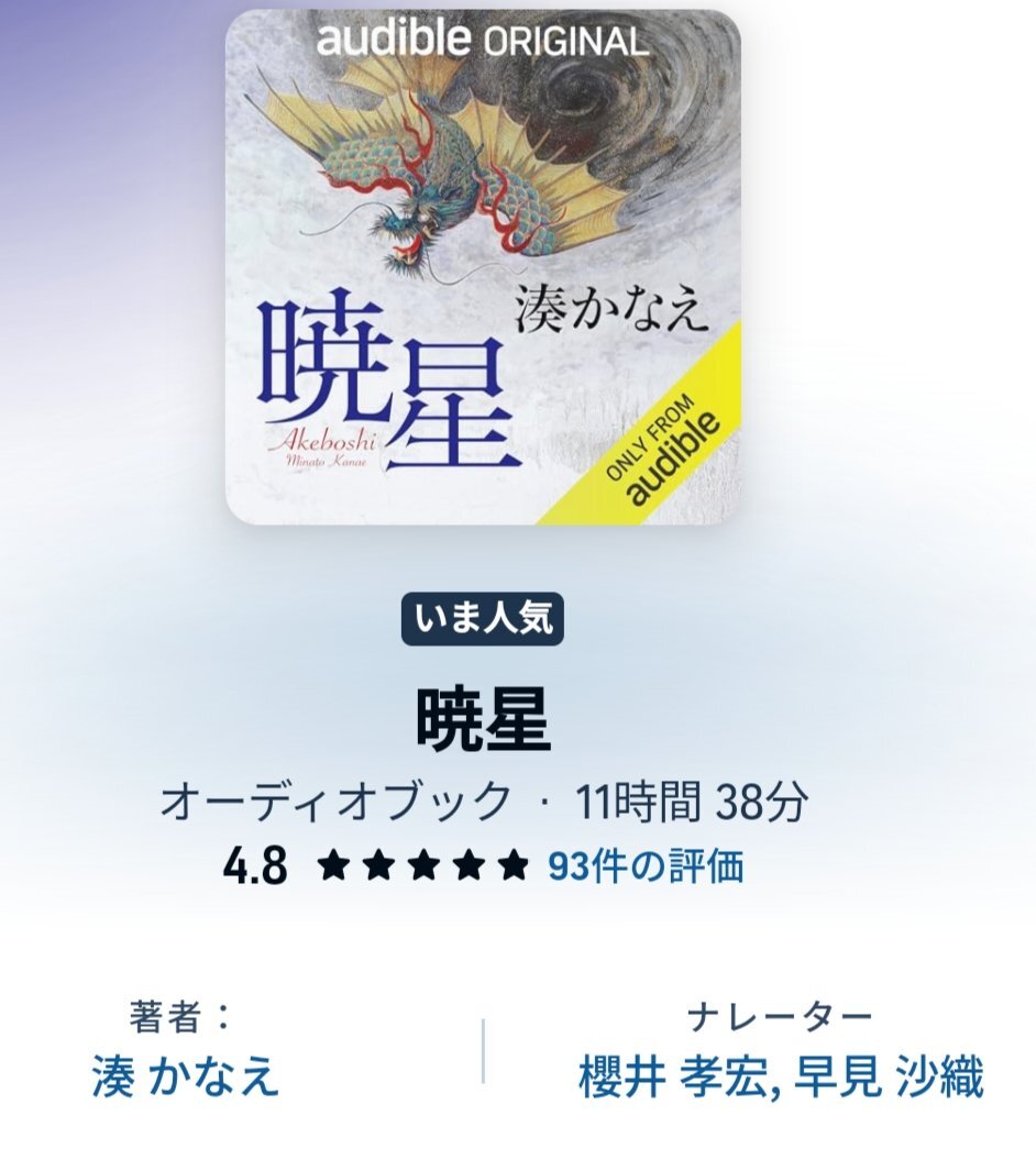ファン必聴! 湊かなえ最新作『暁星』 書籍の発売を待たずにAudibleで聴けるの、知ってる? ➡️amazon.co.jp/dp/B0FWLWKYHC/… 櫻井孝宏と早見沙織の朗読で、物語の世界に深く、一瞬で引き込まれます… #湊かなえ #暁星 #櫻井孝宏 早見沙織